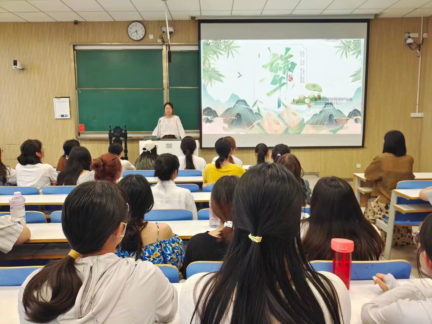 岁至端阳,粽香袅袅。为了加强社团成员对端午节的了解,感受伟大爱国诗人——屈原的高尚人格和高洁情操,传承发扬优秀民族节俗文化,增强学生民族自豪感和自信心。6月16日,豫南明珠环境保护协会于社科楼515教室举办“古韵传千年,诗词颂端午”主题团课。