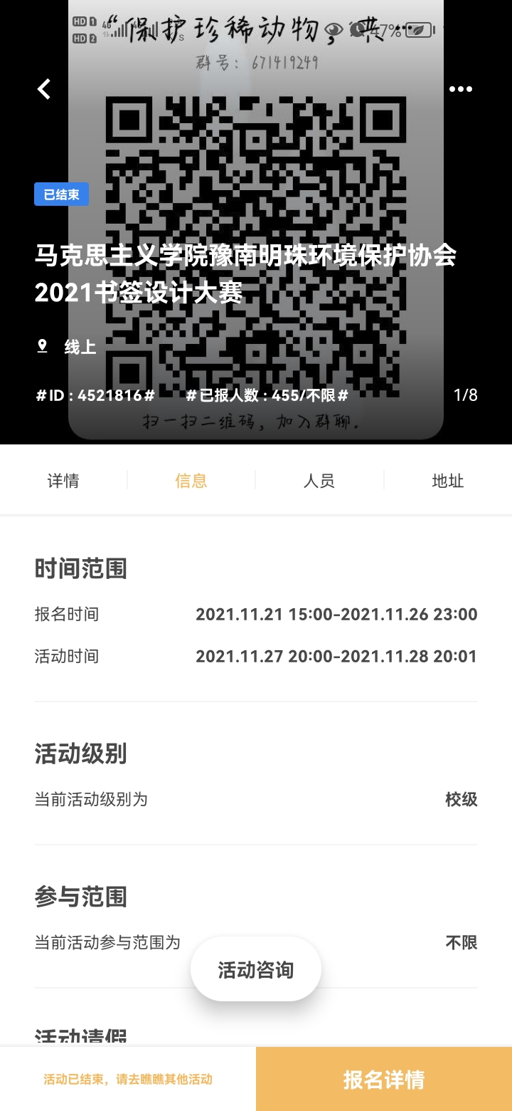 本次活动共分为前期宣传、收集作品、评委打分三个部分。首先,社团通过多渠道进行宣传,详细地介绍了活动的背景、内容与意义,号召学生主动参与活动,将生态文明思想落到实处,起到了充分动员的作用。接着,在活动过程中社团成员各司其职,分工明确,为选手们答疑解惑,以十分的热情投入到工作中。各参赛人员根据自己对保护珍稀动物的理解,查阅和搜集相关资料,在活动规定时间内设计书签。随后,参赛作品统一汇总到评委老师手中,秉持公开公正公平的原则逐一进行打分。最后,社长对获奖名单进行公示,至此本次活动圆满结束。