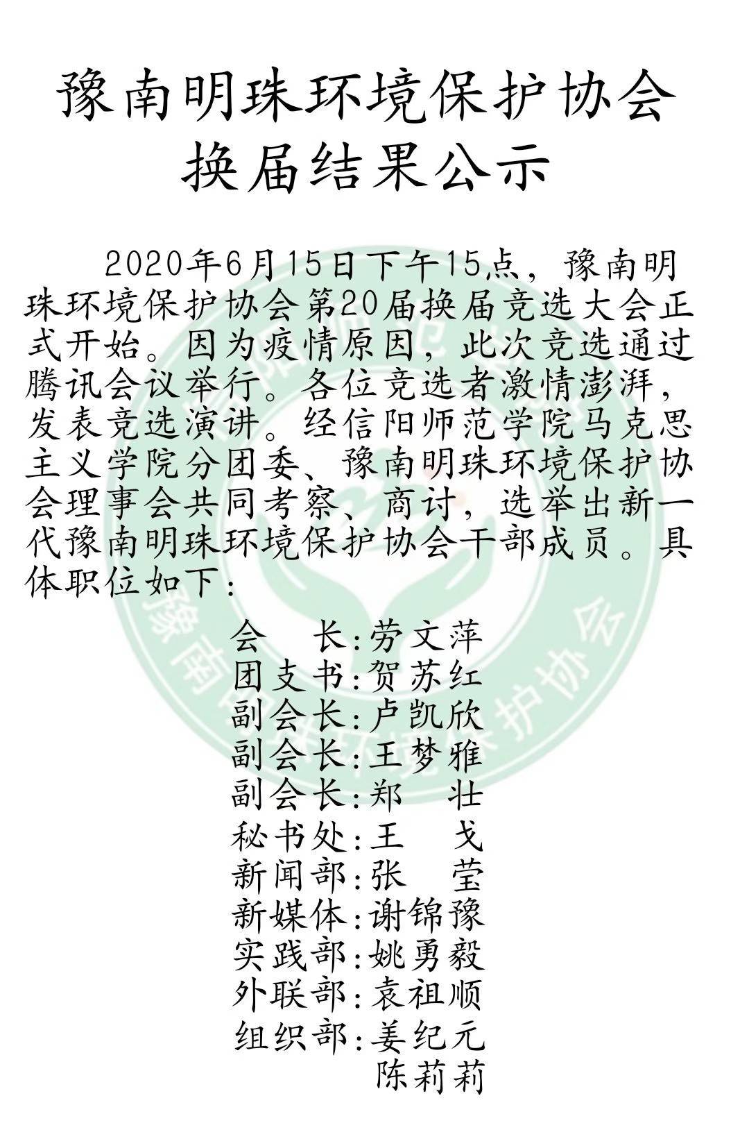6月15日下午,豫南明珠环境保护协会换届竞选大会在线上会议平台腾讯会议顺利举行。小说狂人 分团委社团分管主席、社团会长、团支书、各部部长及19级社团成员共同参加了此次会议。会议由会长吕苗苗主持。