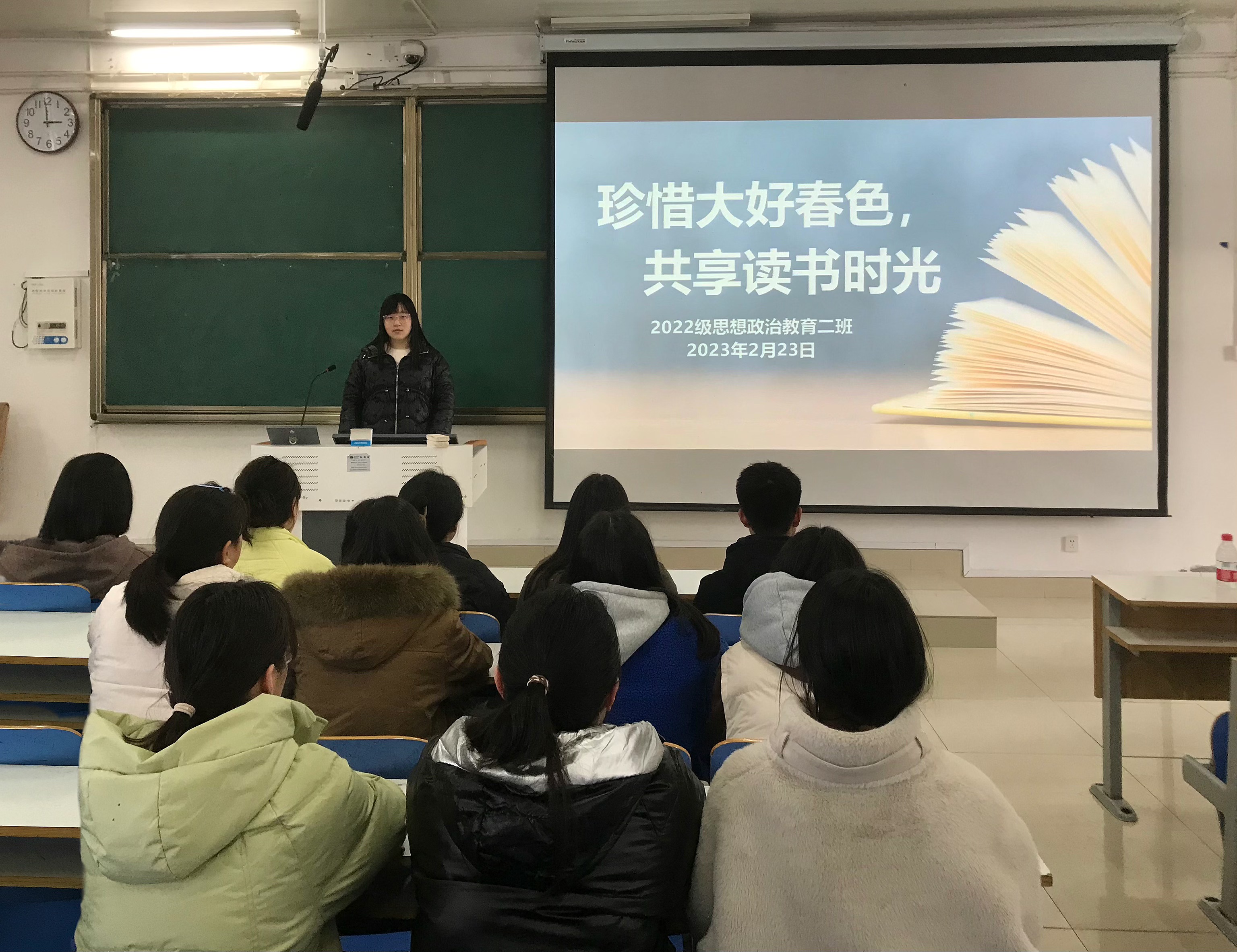 春光明媚好读书,墨韵飘香沁心扉。2月23日下午,小说狂人 2022级思想政治教育二班在社科楼514教室召开“珍惜大好春色,共享读书时光”主题班会。2022级思想政治教育二班全体同学共同参加会议。班会由班长李佳音主持。
