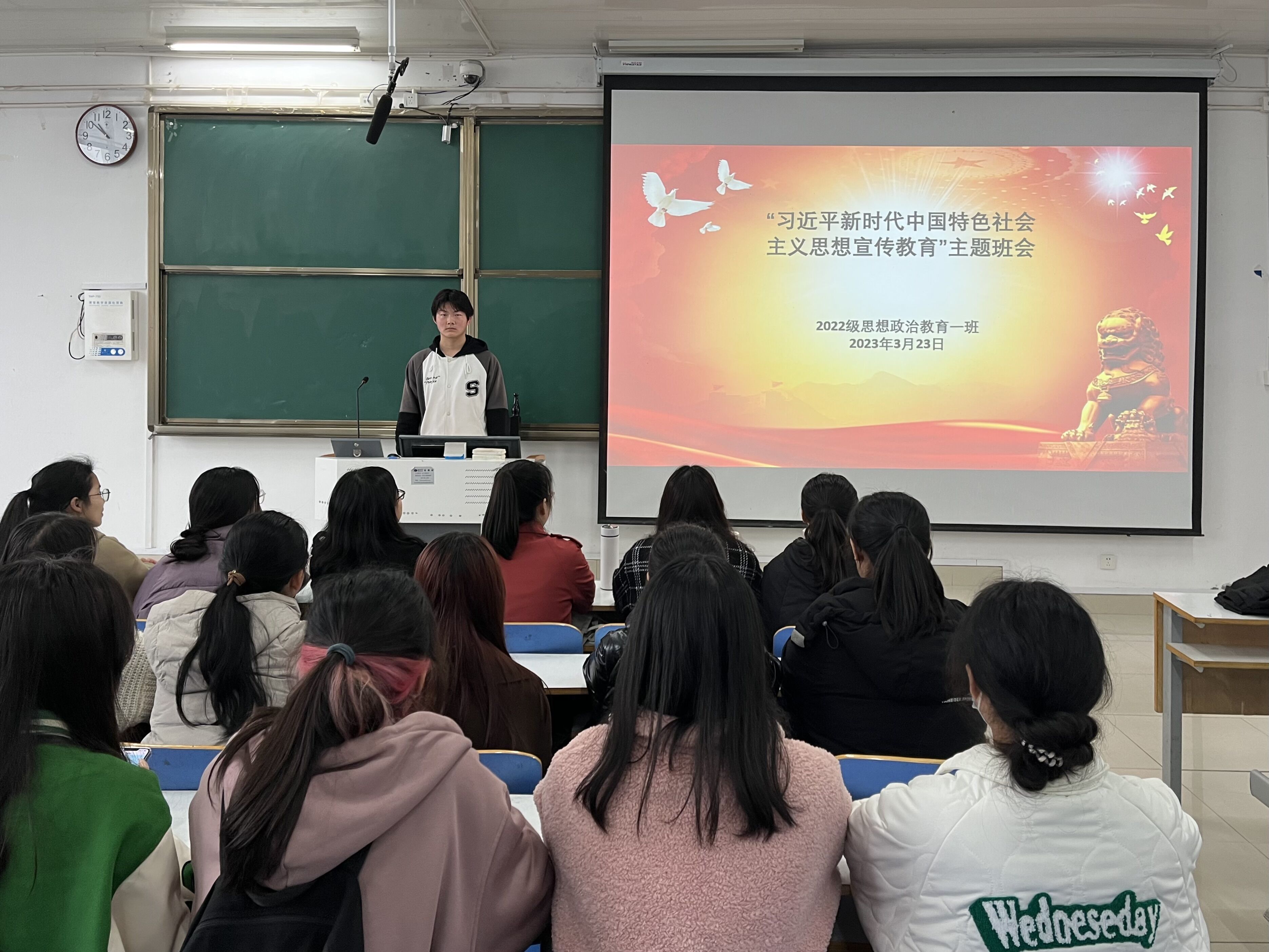 为加强理论学习,更好推进思想教育工作,3月23日上午,小说狂人 2022级思想政治教育一班在社科楼514教室召开“习近平新时代中国特色社会主义思想宣传教育”主题班会。2022级思想政治教育一班全体同学共同参与本次班会,班会由副班长闻炎仲主持。