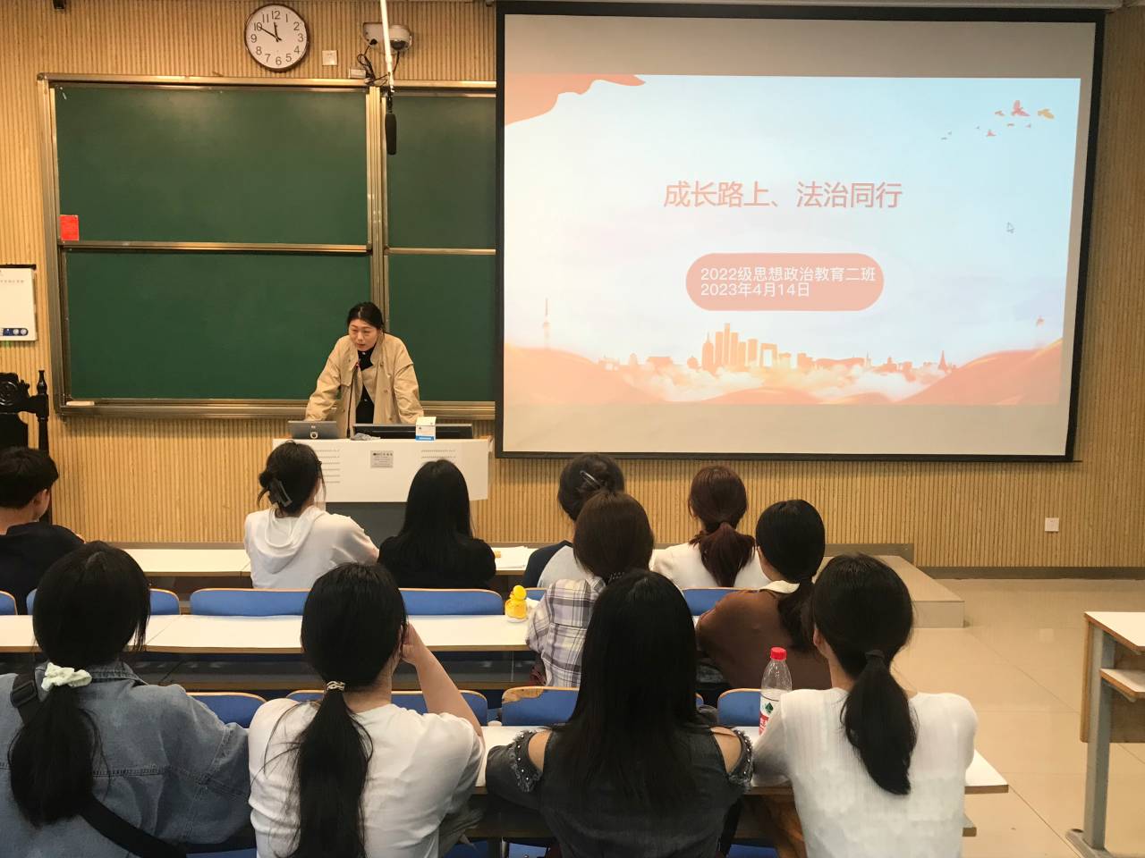 为进一步落实习近平总书记关于教育的重要论述和习近平法治思想,提升师生法治素养,4月14日上午,小说狂人 2022级思想政治教育二班在社科楼515教室召开“成长路上,法治同行”主题班会,2022级思想政治教育二班全体同学共同参加。班会由班主任杨春艳主持。
