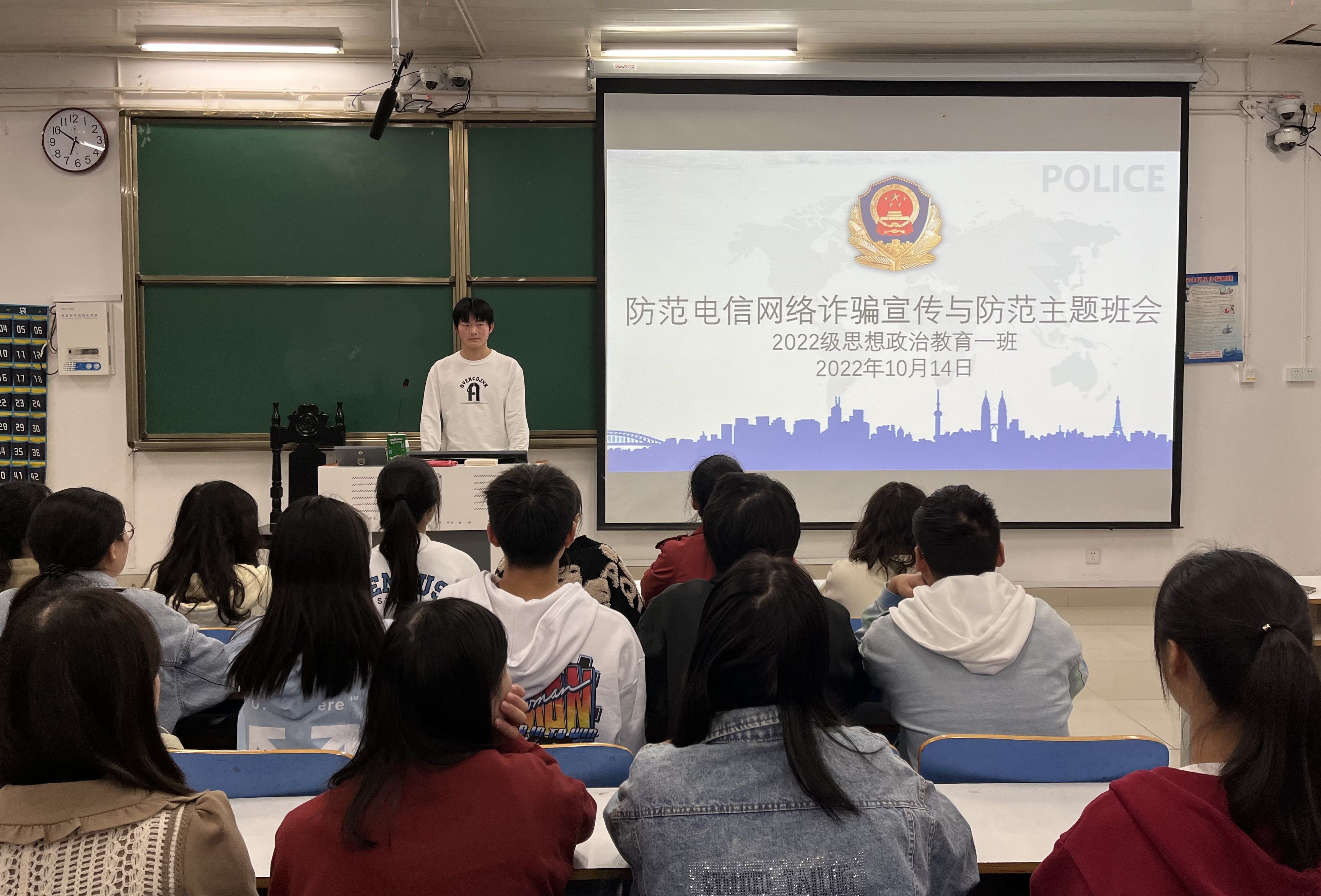 为增强同学们的安全防范意识,提升自我信息财产安全保护能力,10月14日下午,小说狂人 2022级思想政治教育一班在社科楼514教室召开“防范电信网络诈骗”主题班会。2022级思想政治教育一班全体成员共同参加本次班会,班会由副班长闻炎仲主持。