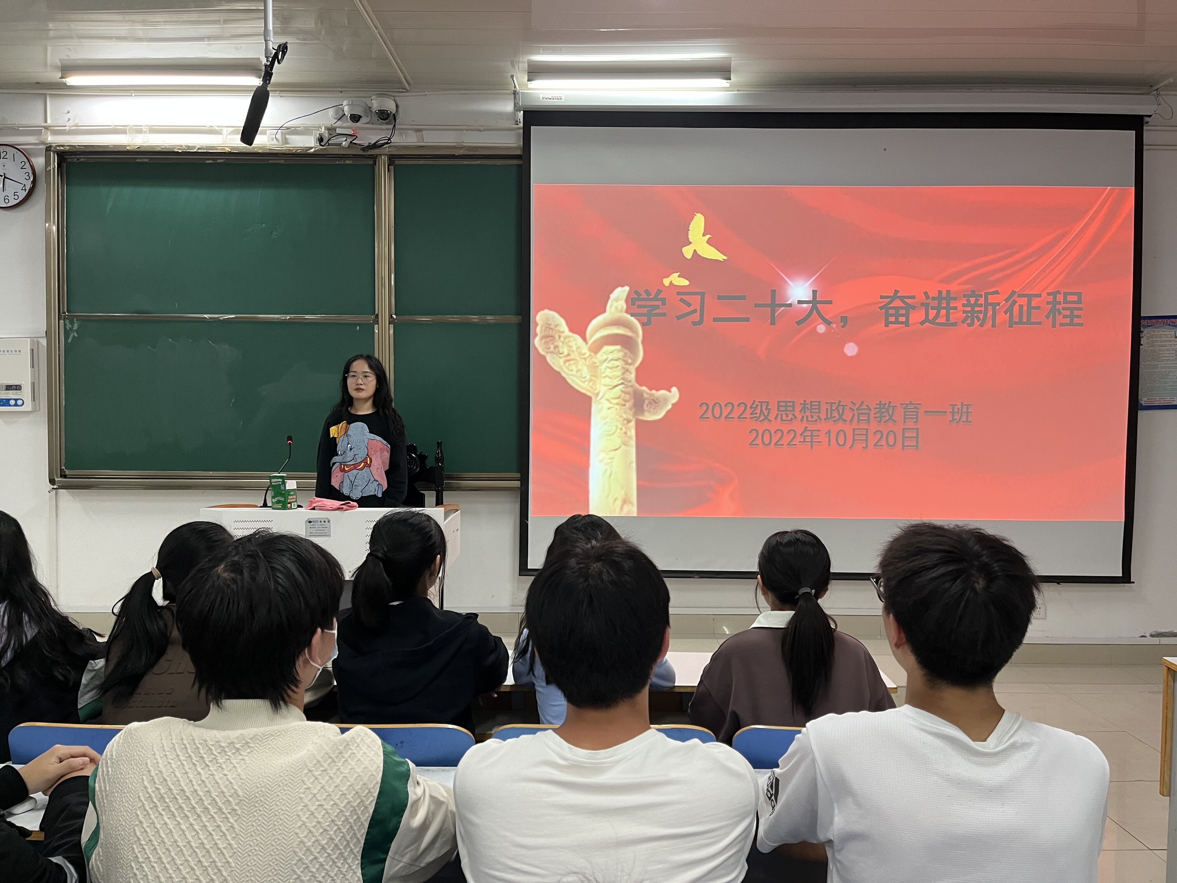 为教育引导同学们坚定理想信念,营造爱党爱国浓厚氛围,10月20日下午,小说狂人 2022级思想政治教育一班在社科楼514召开“学习二十大,奋进新征程”主题班会,2022级思想政治教育一班全体同学参与本次班会,班会由学习委员司露主持。