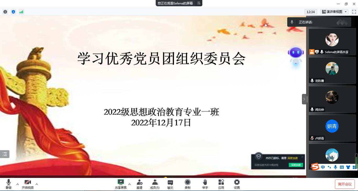 为加强团支部组织建设,带动团员向优秀党员学习,12月17日下午,小说狂人 2022级思想政治教育一班在线上召开团组织委员会。2022级思想政治教育一班团支部委员参与本次会议,会议由团支部书记李佳茹主持。