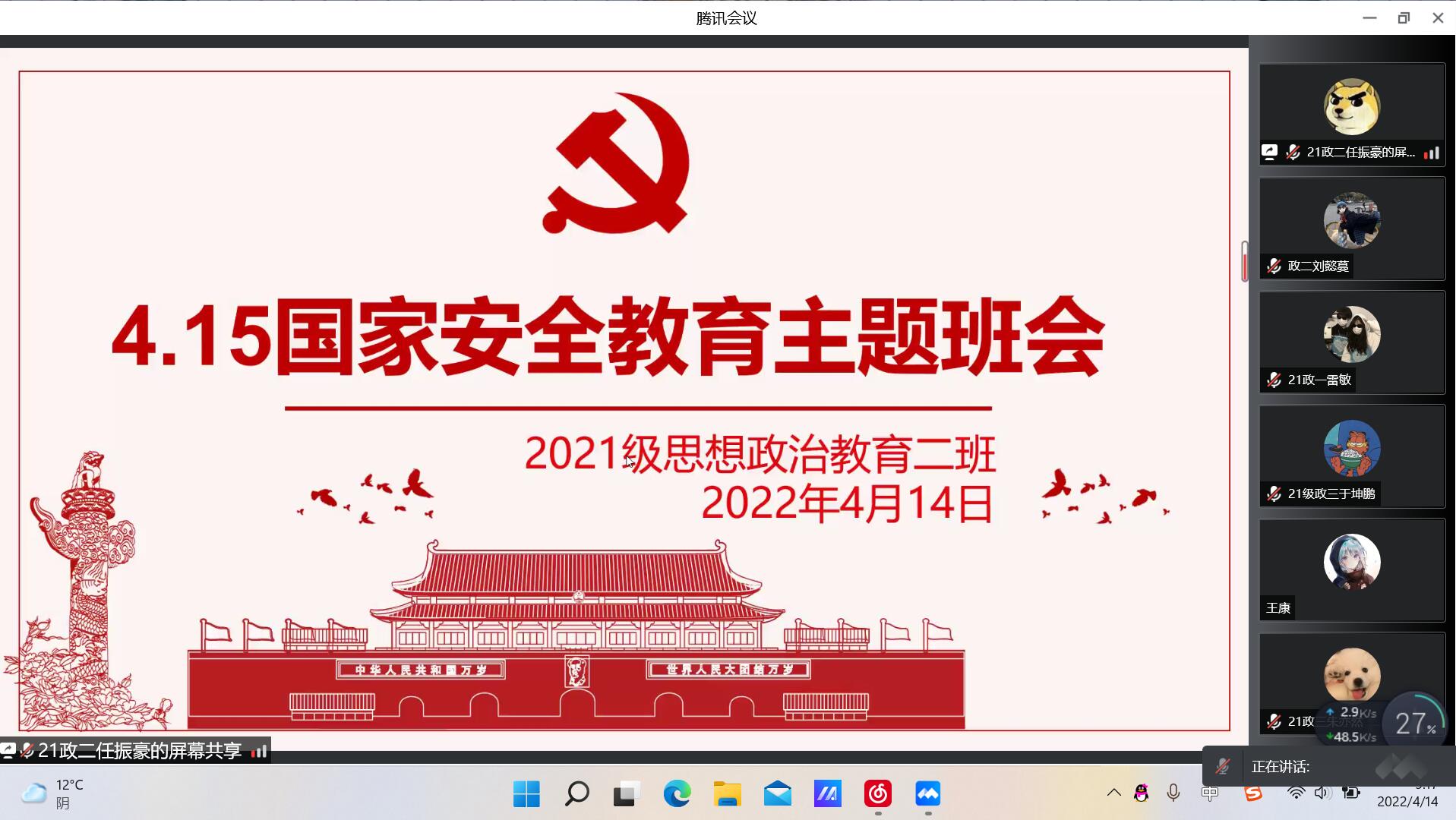 4月14日,小说狂人 2021级思想政治教育二班在腾讯会议召开“4.15国家安全教育”主题班会。2021级思想政治教育二班全体成员参与此次主题班会,班会由团支书王婧欣主持。