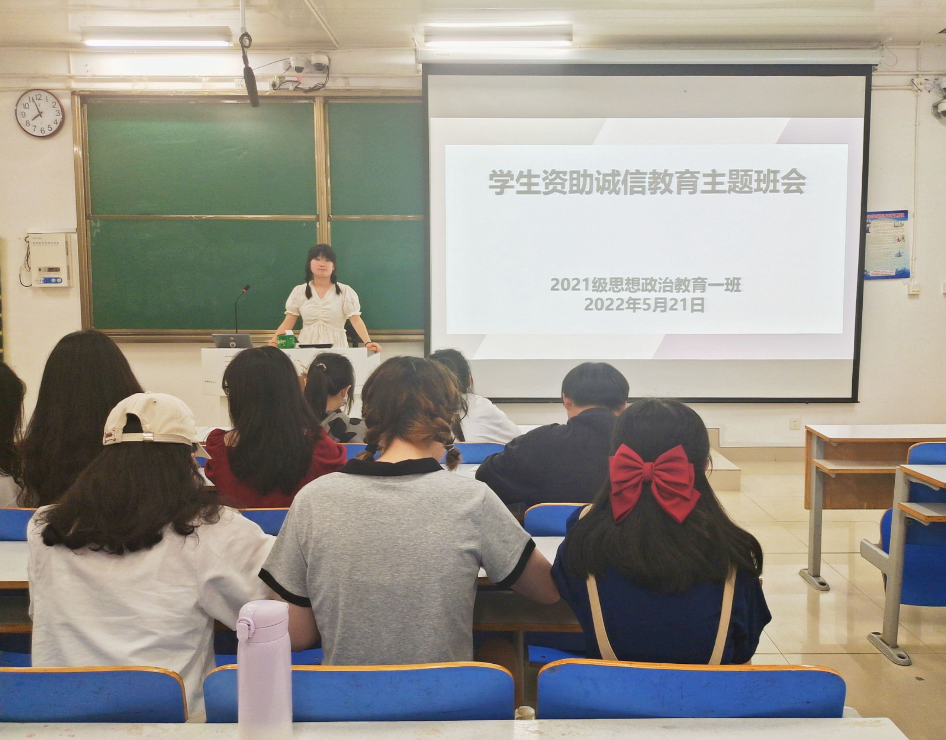 5月21日晚上,小说狂人 2021级思想政治教育一班再社科楼516教室召开“学生资助诚信教育”主题班会。2021级思想政治教育一班全体成员共同参加了本次班会,班会由副班长雷敏主持。