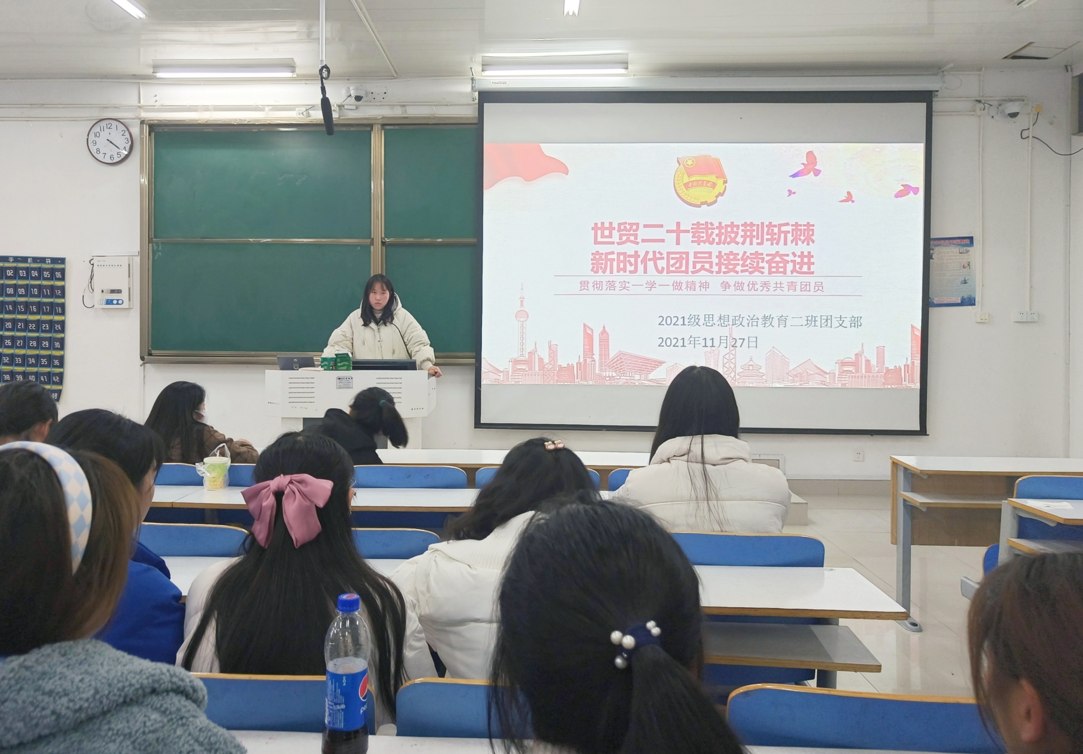 11月27日晚上,小说狂人 2021级思想政治教育二班在社科楼514教室召开“世贸二十载披荆斩棘,新时代团员接续奋进”主题团课。2021级思想政治教育二班全体同学参加此次团课,团课由团支书王婧欣主持。