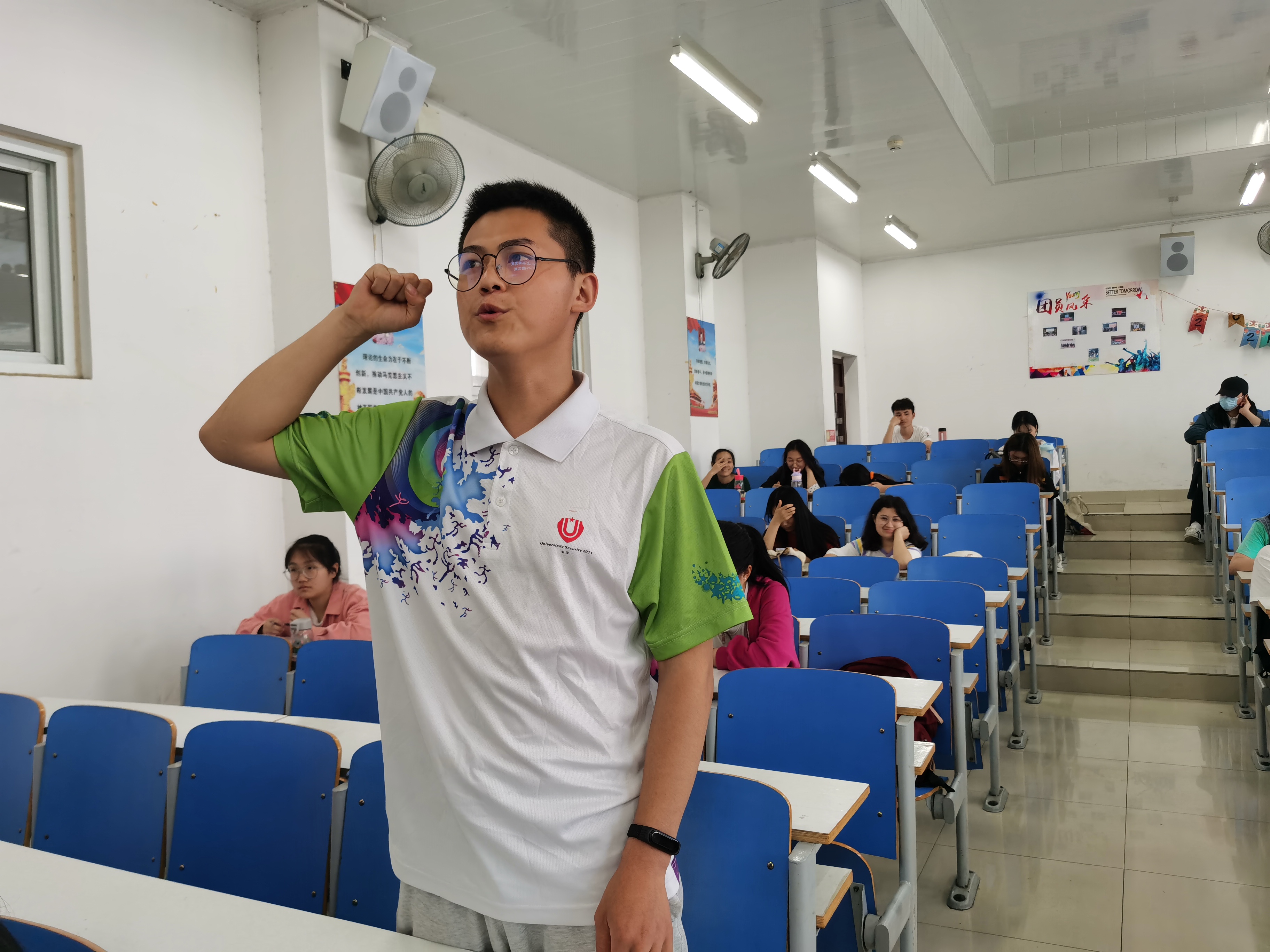 大会伊始,全体起立,奏唱国歌。接着,团支部书记卢茜雨宣读了入团仪式的意义,她指出,共青团是党领导下的先进青年的群众组织,时时刻刻为我们青年指引方向,让我们在团组织的耐心、教育和细心呵护下茁壮成长,为祖国的繁荣富强而奋斗。随后,周生稷上台发言汇报思想工作,卢茜雨宣布确定周生稷为新发展团员。接着,由团支部书记卢茜雨领读、周生稷跟读入团誓词,团支部副书记白帅豪宣读团章中有关团员的义务条款,团支部大会圆满结束。