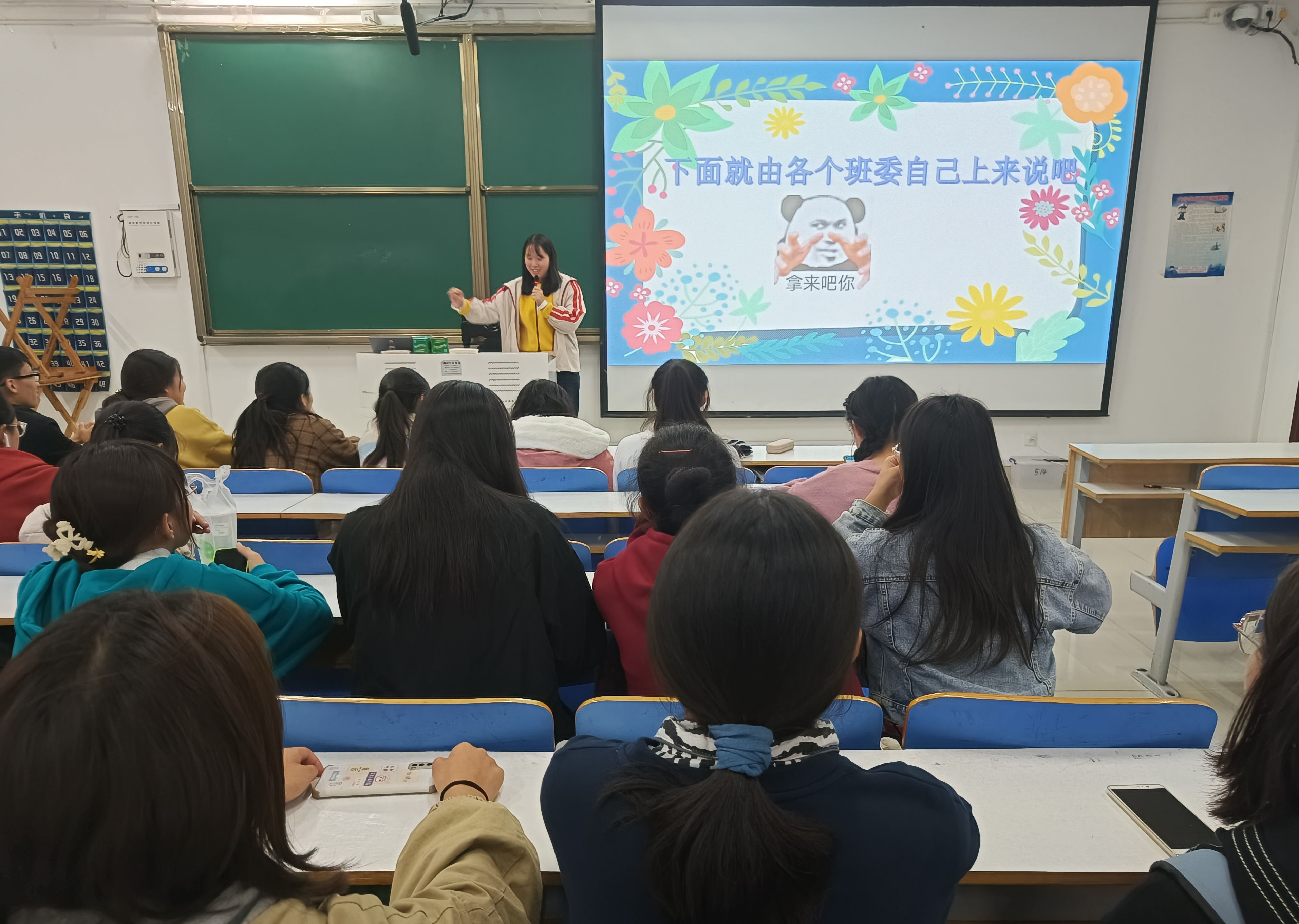 会议伊始,团支书王婧欣对近期工作进行简单汇报。她指出,团支书一职起着上传下达,统筹兼顾的重要作用。不仅要把班主任和学院的各个通知传达并落实到位,并且要以身作则,为班级树立良好榜样。随后,学习委员张利佳分别从课前点名、课后转发学习资料、配合各任课老师展开教学工作等方面作出详细阐述,同时对自身工作作出介绍。各班委依次上台进行发言。会议最后,王婧欣对本次班会进行总结,她表示,班委是班级发展的“火车头”,各班委要牢记竞选初心,自觉树立服务意识,切实履行班委职责,为班级向好的发展贡献力量和智慧。