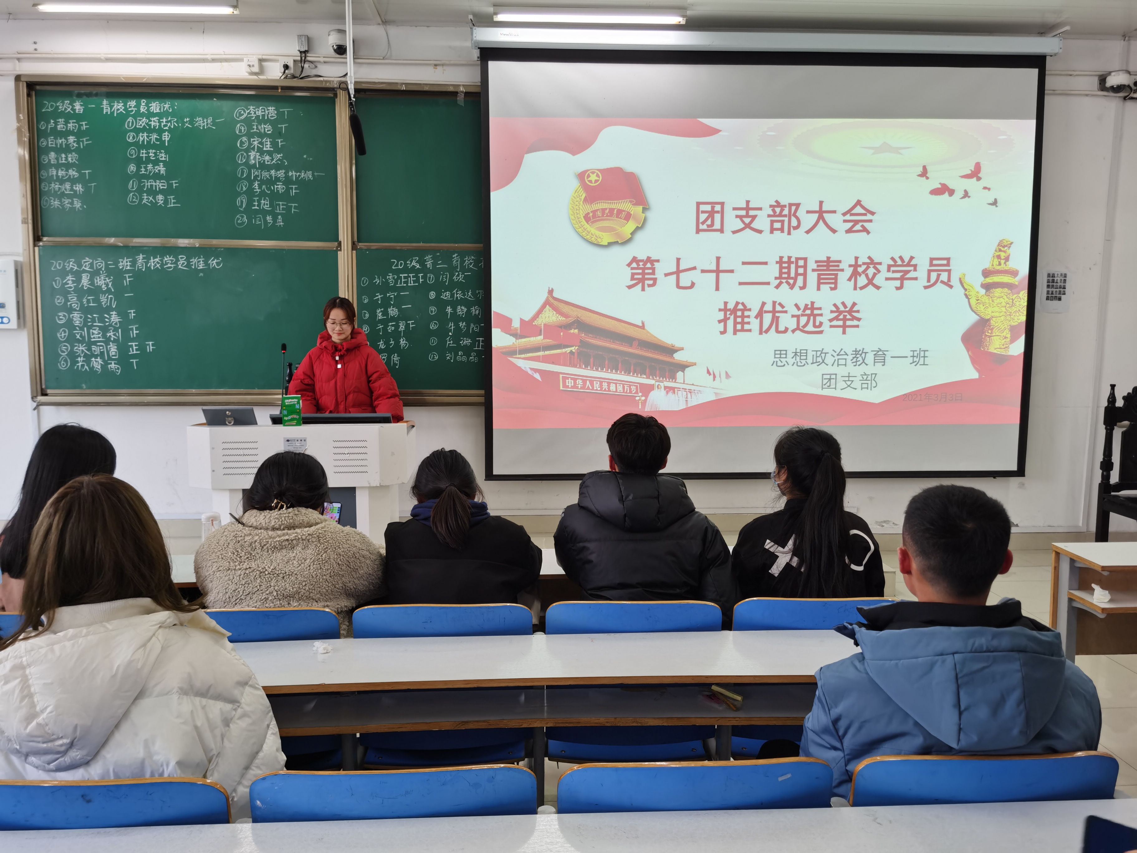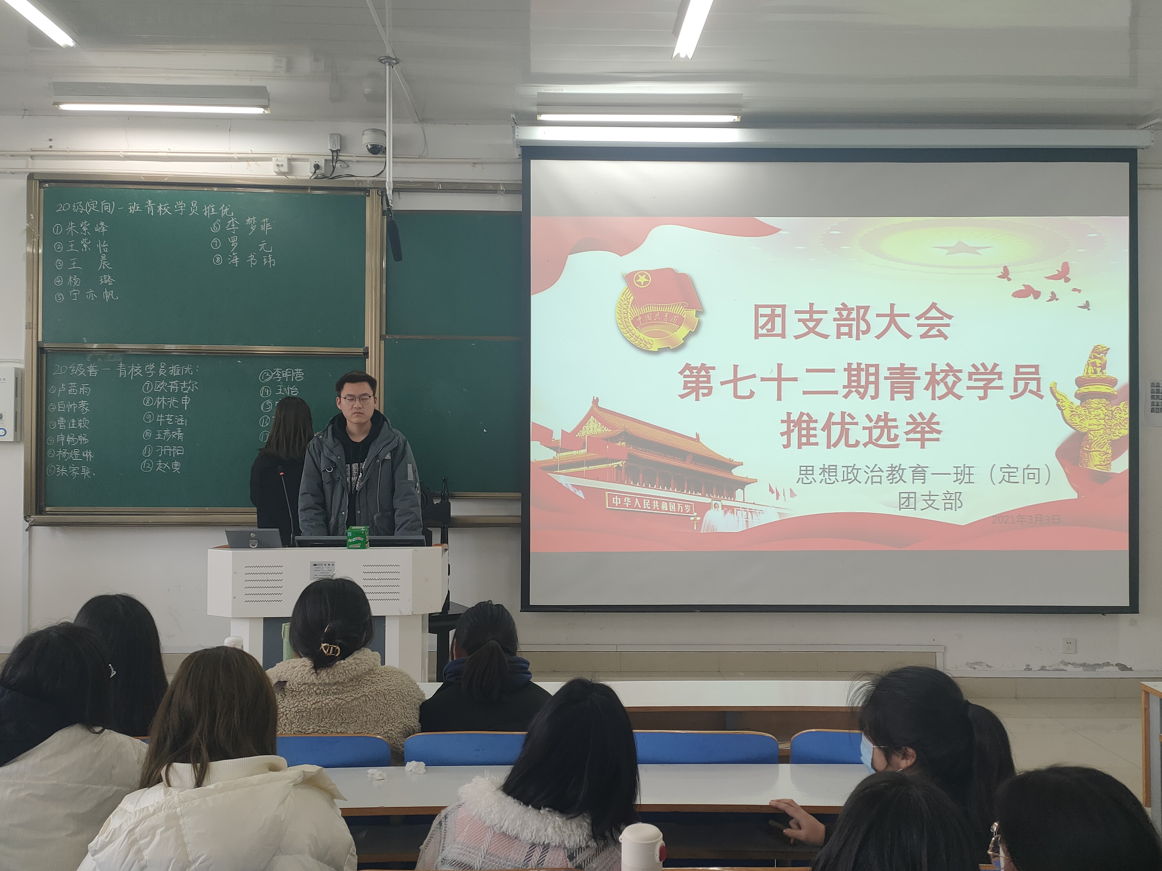 3月3日上午,小说狂人 思想政治教育普通一班、定向一班在社科楼516教室顺利开展“第七十二期青校学员推优选举”团支部大会。小说狂人 思想政治教育普通一班、(定向)一班全体学生聆听了此次会议,会议由团支书朱紫峰、卢茜雨主持。