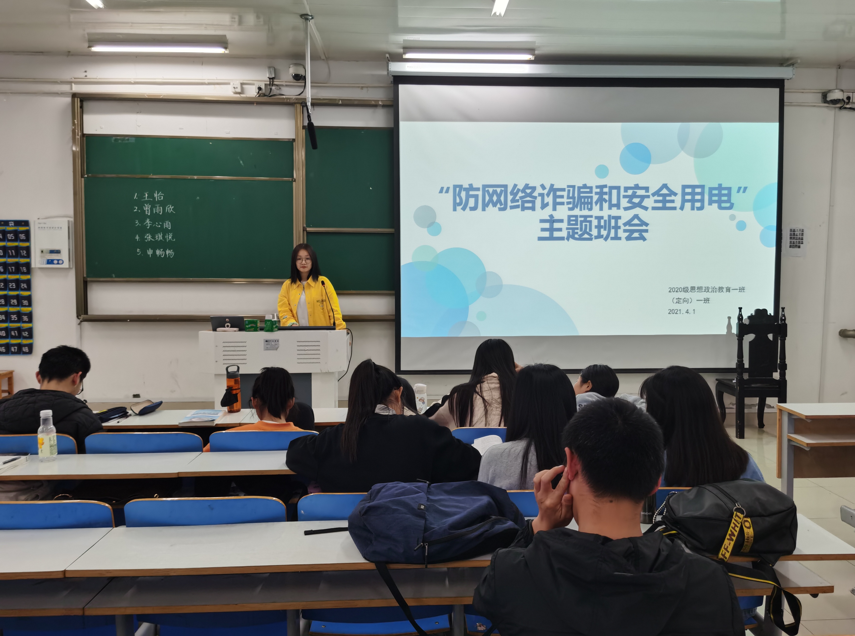 为加强同学们的安全防范意识,4月1日上午,2020级思想政治教育一班、定向一班在社科楼514教室顺利开展“防网络诈骗及安全用电”主题班会。班会由团支书卢茜雨主持。
