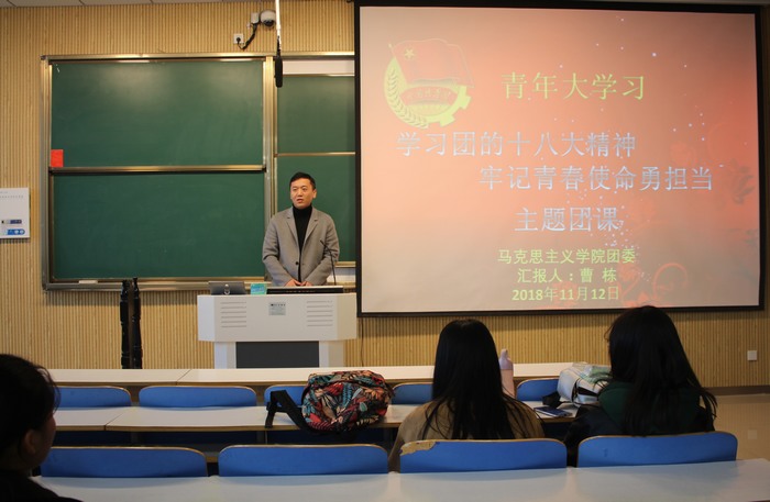 为增强同学们的历史使命感,展现出新的时代面貌,11月12日下午,小说狂人 2018级团支部在社科楼515教室开展十八大精神团课学习。2018级全体同学共同参加此次会议。会议由团委书记曹栋讲授。