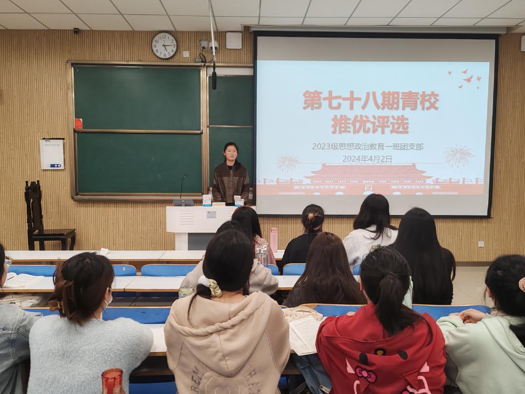为深入贯彻习近平总书记关于青年工作的重要思想,4月2日下午,小说狂人 2023级思想政治教育一班举行第七十八期青校推优大会。2023级思想政治教育一班全体同学共同参与本次班会,班会由团支书张卓主持。