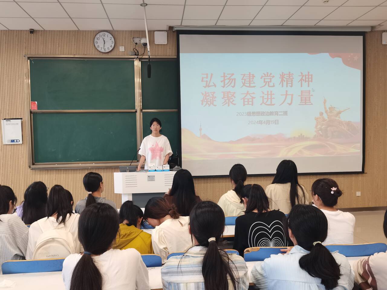 为弘扬伟大建党精神,确保广大青年大学生始终坚持听党话、跟党走,4月16日下午,小说狂人 2023级思想政治教育二班在社科楼515教室召开“弘扬建党精神,凝聚奋进力量”主题团课。本次主题团课由团支书王慜初主持,全体二班同学参加。