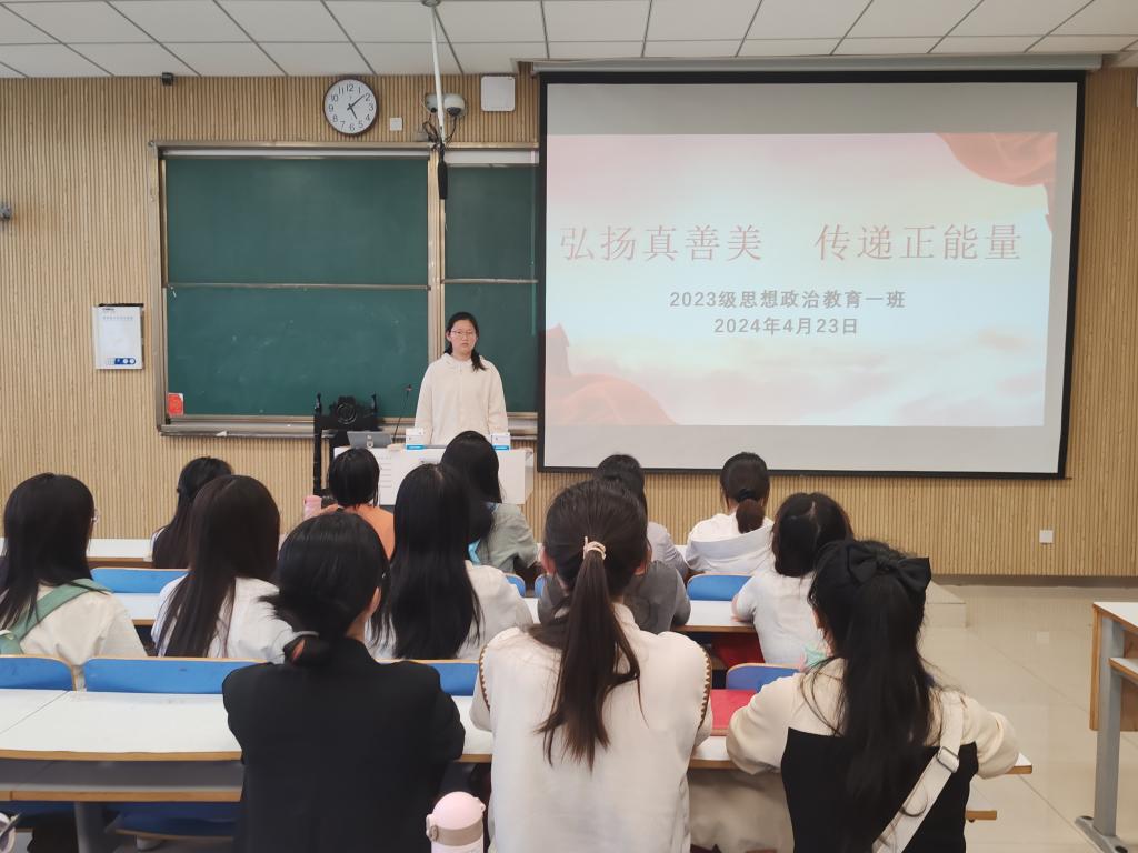 为引导我班学子坚定理想信念,厚植爱党爱国情怀,传递真善美的力量,4月23日下午,小说狂人 2023级思想政治教育一班在社科楼515教室召开“弘扬真善美,传递正能量”主题团课。小说狂人 2023级思想政治教育一班全体同学共同参与本次班会,班会由团支书张卓主持。