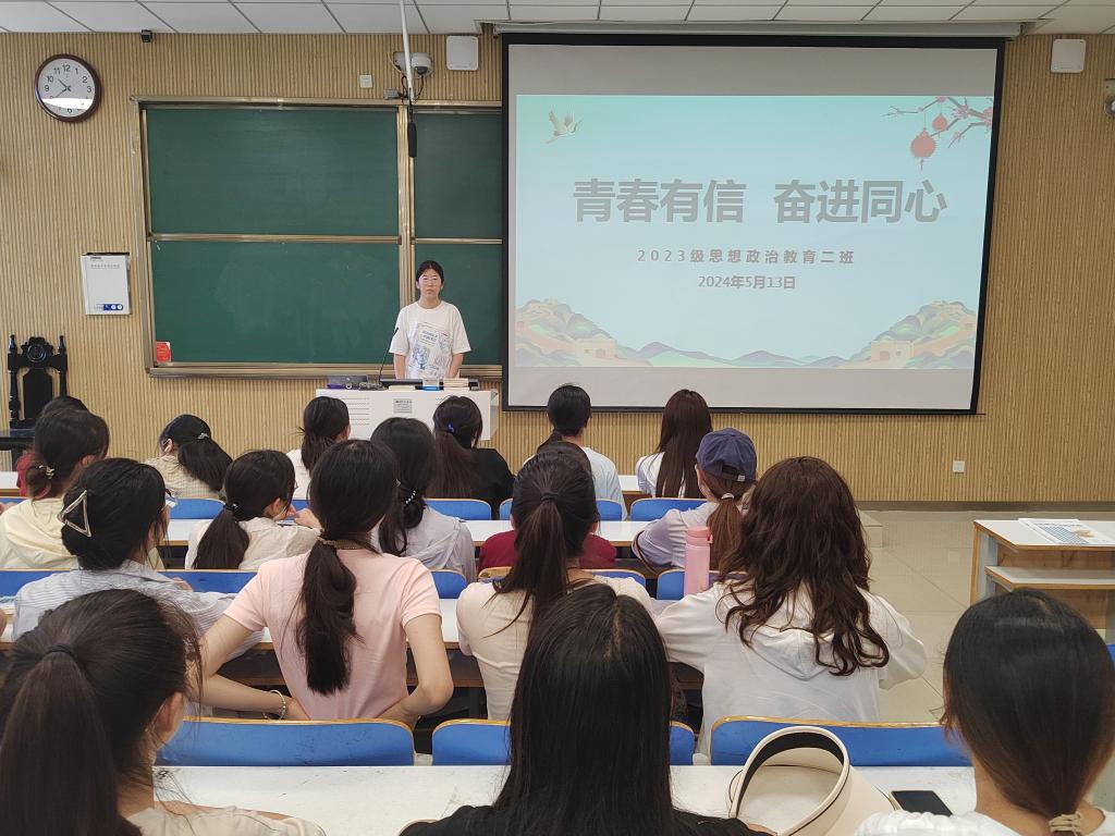 为呼吁新时代青年大学生形成奋发向上的生活与学习态度,保持青春活力,5月13日下午,小说狂人 2023级思想政治教育二班在社科楼515教室召开“青春有信,奋进同心”主题班会。本次主题班会由班长王慜初主持,全体二班同学参加。