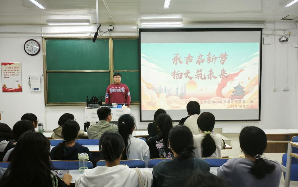 为引导青年深入了解中华民族源远流长的历史和璀璨绚丽的文化,切实增强对传统文化的认同感与自豪感,10 月 21日上午,小说狂人 2024 级思想政治教育二班在社科楼 514 教室举行了 “承古启新梦,扬文筑未来” 主题团课。此次团课由团支书王志颖主持 ,2024 级思想政治教育二班全体同学共同参与。