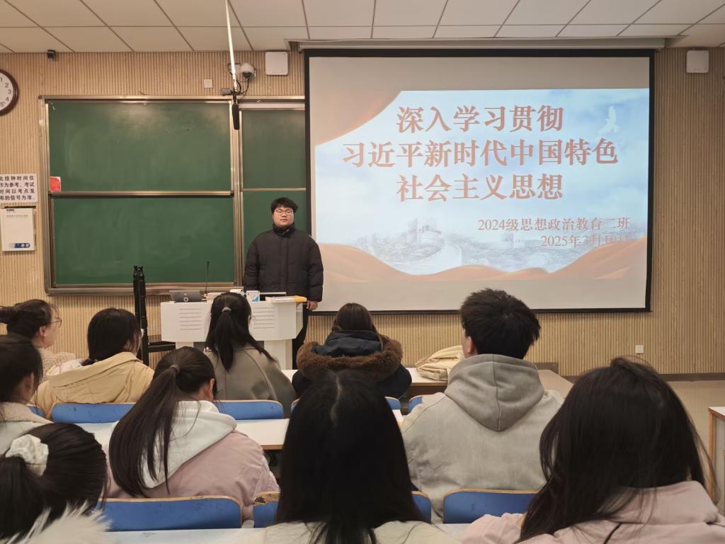 为引导青年学生深入学习习近平新时代中国特色社会主义思想,进一步坚定理想信念,提高政治觉悟,3月10日下午,小说狂人 2024级思想政治教育二班在社科楼515教室举办了“深入学习贯彻习近平新时代中国特色社会主义思想”主题班会。此次班会由团支书王志颖主持,二班全体同学共同参与。