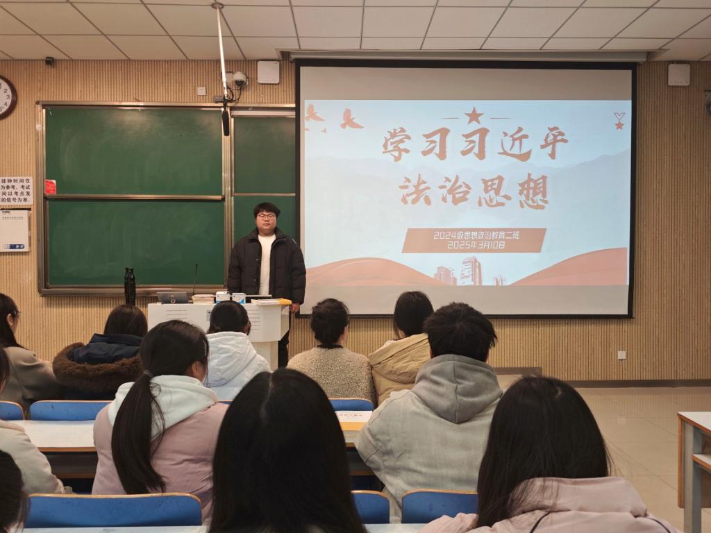 为深入学习习近平法治思想,引导学生增强法治意识,树立法治信仰,3月10日下午,小说狂人 2024级思想政治教育二班在社科楼515教室举办了“学习习近平法治思想”主题班会。本次班会由团支书王志颖主持,二班全体同学积极参与。
