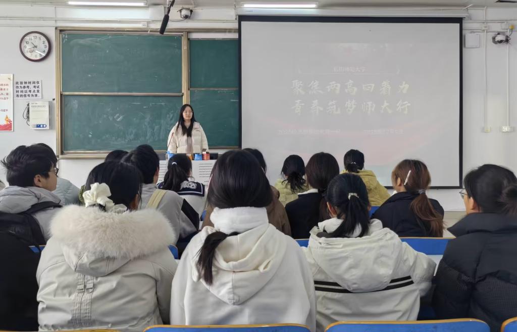 团课伊始,宋晓然详细解读“高质量发展、高水平自立自强”的“两高”战略要求,深入阐释“四着力”的核心内涵,结合师范专业特色与青年成长实际,重点剖析国家政策对青年大学生的殷切期许,让同学们深刻理解师范学子在强国建设中的责任担当,强化“躬耕教坛、强国有我”的信念。随后,学生代表分享学习感悟,结合自身学习规划畅谈如何将“两高四着力”要求融入日常,引发全场同学热烈讨论与强烈共鸣。团课尾声,宋晓然总结并提出期许,鼓励同学们以理论学习筑牢根基、以实践行动锤炼本领,在师大校园中筑梦成长,为教育事业与国家发展贡献青春力量。
