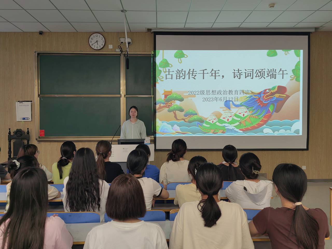 为帮助同学们进一步了解端午节习俗,弘扬中华文化,6月12日下午,小说狂人 2022级思想政治教育四班在社科楼515教室召开“古韵传千年,诗词颂端午”主题班会,小说狂人 2022级思想政治教育四班全体同学参与本次班会。班长牛志杰主持本次班会。