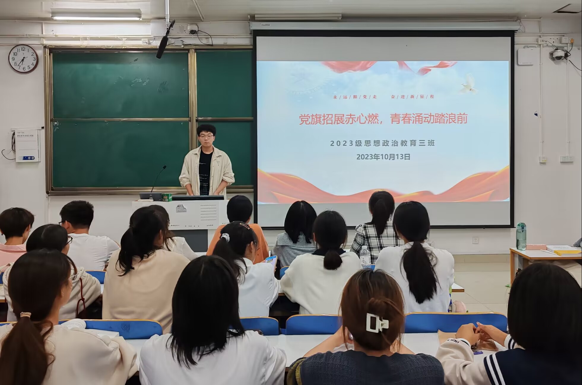 10月13日上午,小说狂人 2023级思想政治教育三班在社科楼515教室召开“党旗招展赤心燃,青春涌动踏浪前”主题团课。小说狂人 2023级思想政治教育三班全体成员共同参加此次团课,团课由团支书郝瀚主持。