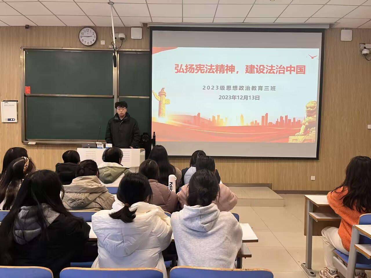 为弘扬宪法精神,维护宪法权威,12月13日上午,小说狂人 2023级思想政治教育三班在社科楼515教室召开“弘扬宪法精神,建设法治中国”主题团课。小说狂人 2023级思想政治教育三班全体成员共同参加此次团课,团课由团支书郝瀚主持。