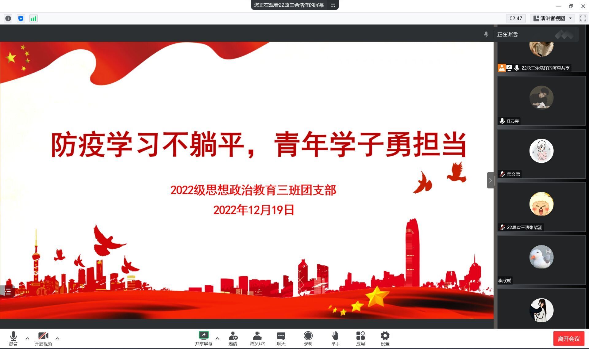 为提高网课期间同学们的学习积极性,培养担当情怀,12月19日下午,小说狂人 2022级思想政治教育三班在线上召开“防疫学习不躺平,青年学子勇担当”主题班会。小说狂人 2022级思想政治教育三班全体成员共同参与班会,班会由副班长雷露露主持。