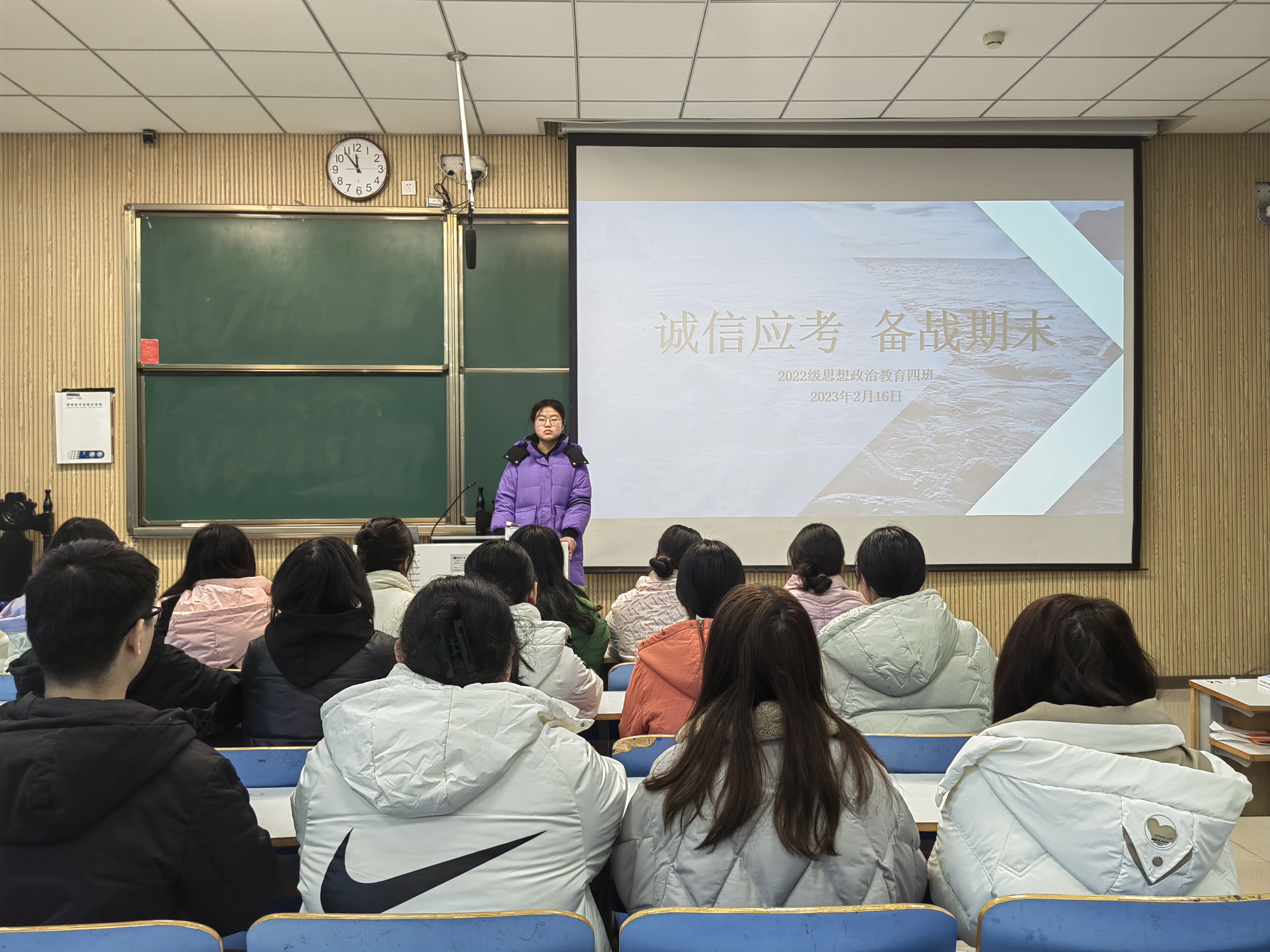 为加强学院学风建设和诚信教育,营造公平、公正的考试氛围,2月16日下午,小说狂人 2022级思想政治教育四班在社科楼515教室召开“诚信应考,备战期末”主题班会,2022级思想政治教育四班全体同学参加本次班会。会议由学习委员熊祎主持。