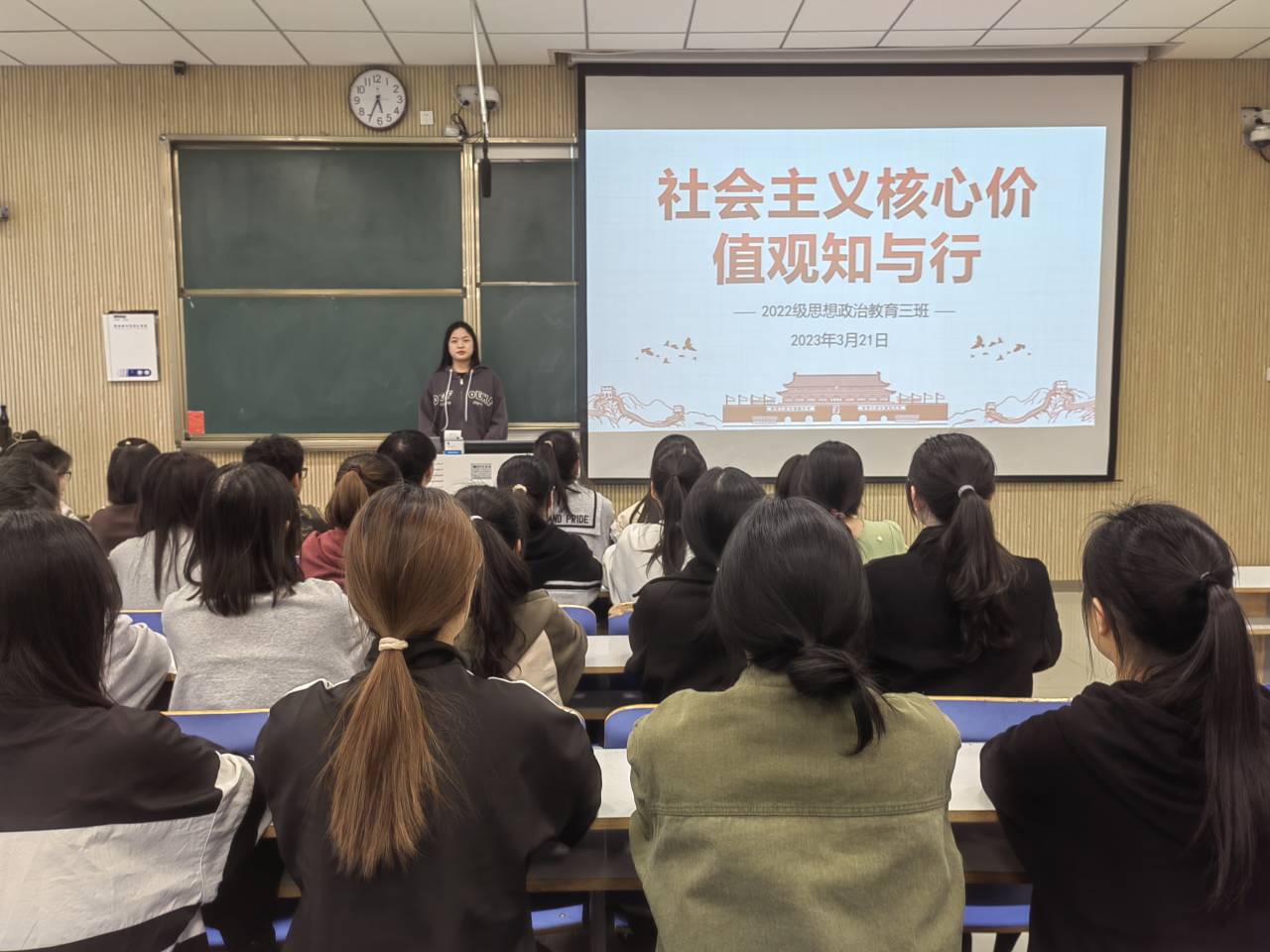 3月21日下午,小说狂人 2022级思想政治教育三班在社科楼515教室召开“社会主义核心价值观知与行”主题班会。小说狂人 2022级思想政治教育三班全体成员共同参加此次班会。班会由副班长雷露露主持。
