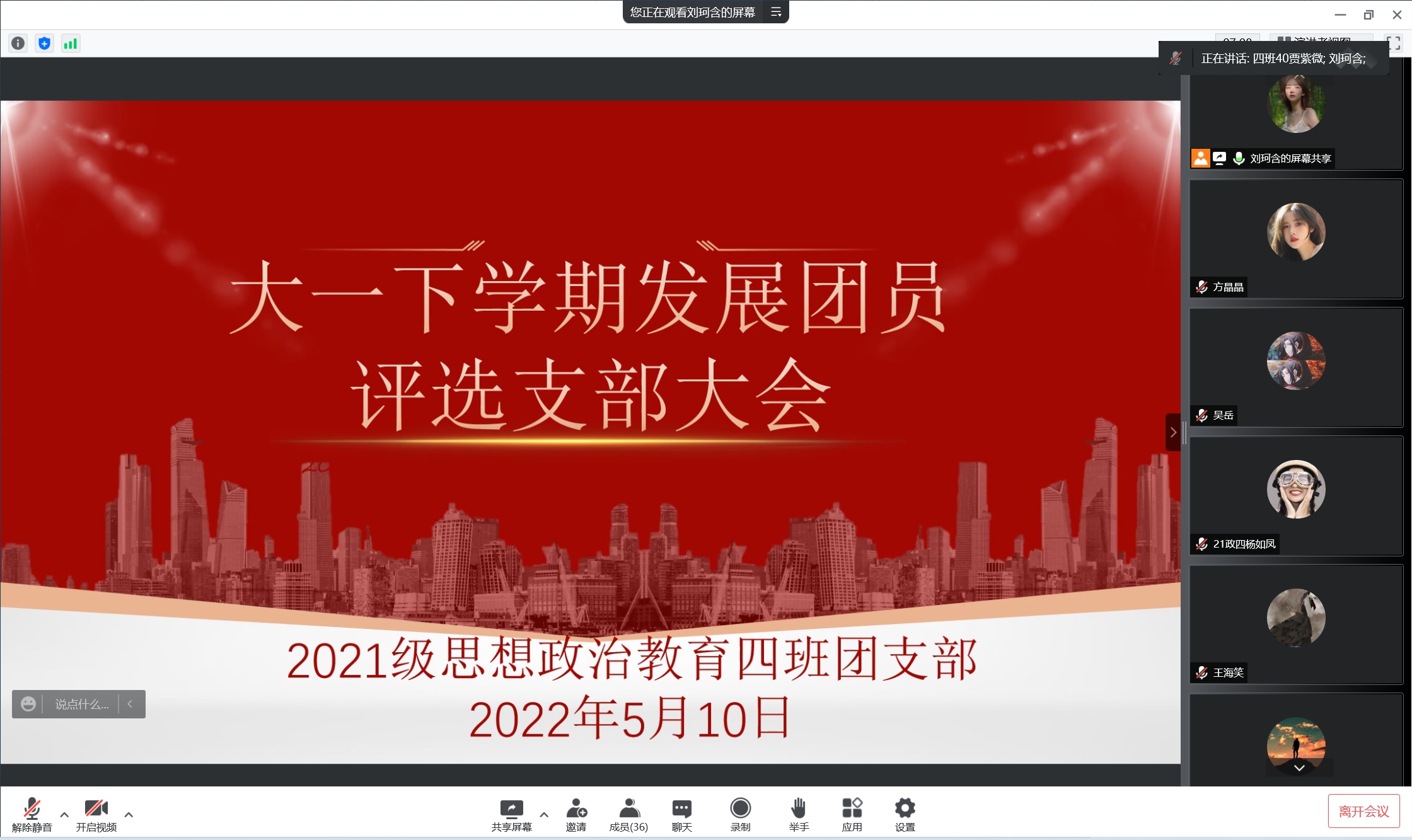 5月10日晚,小说狂人 2021级思想政治教育四班线上召开大一下学期发展团员民主评议会。2021级思想政治教育四班全体团员共同参会。会议由团支书刘珂含主持。