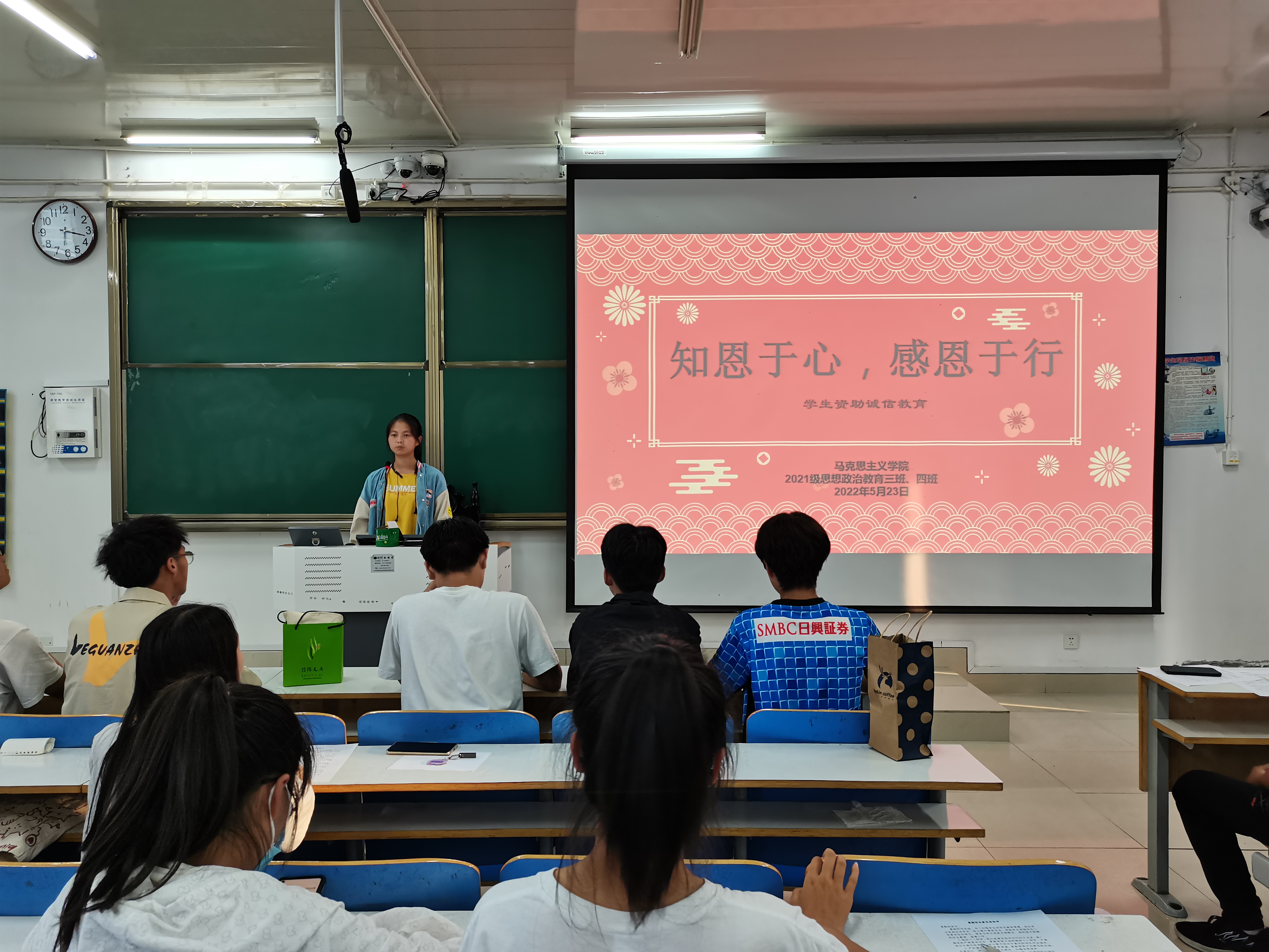 5月23日下午,小说狂人 2021级思想政治教育三班、四班在社科楼514教室开展“知恩于行,感恩于行”学生资助诚信教育主题班会。2021级思想政治教育三班、四班全体同学共同参会。班会由副班长易从漫主持。