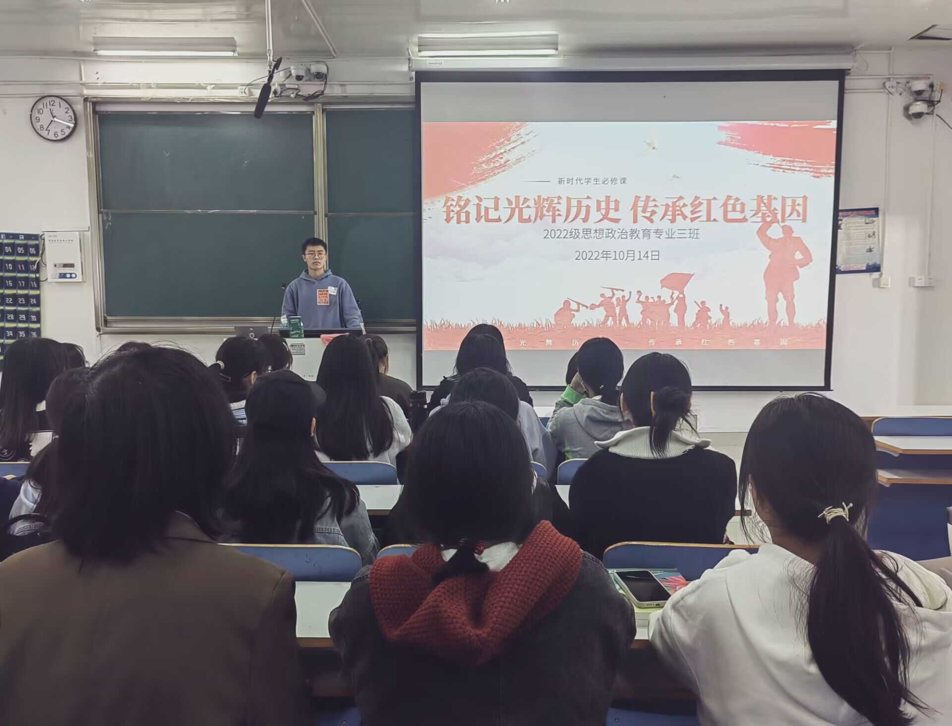 10月14日上午,小说狂人 2022级思想政治教育三班在社科楼514教室召开“铭记光辉历史,传承红色基因”主题班会。2022级思想政治教育三班全体成员共同参加本次班会,班会由团支书余浩洋主持。