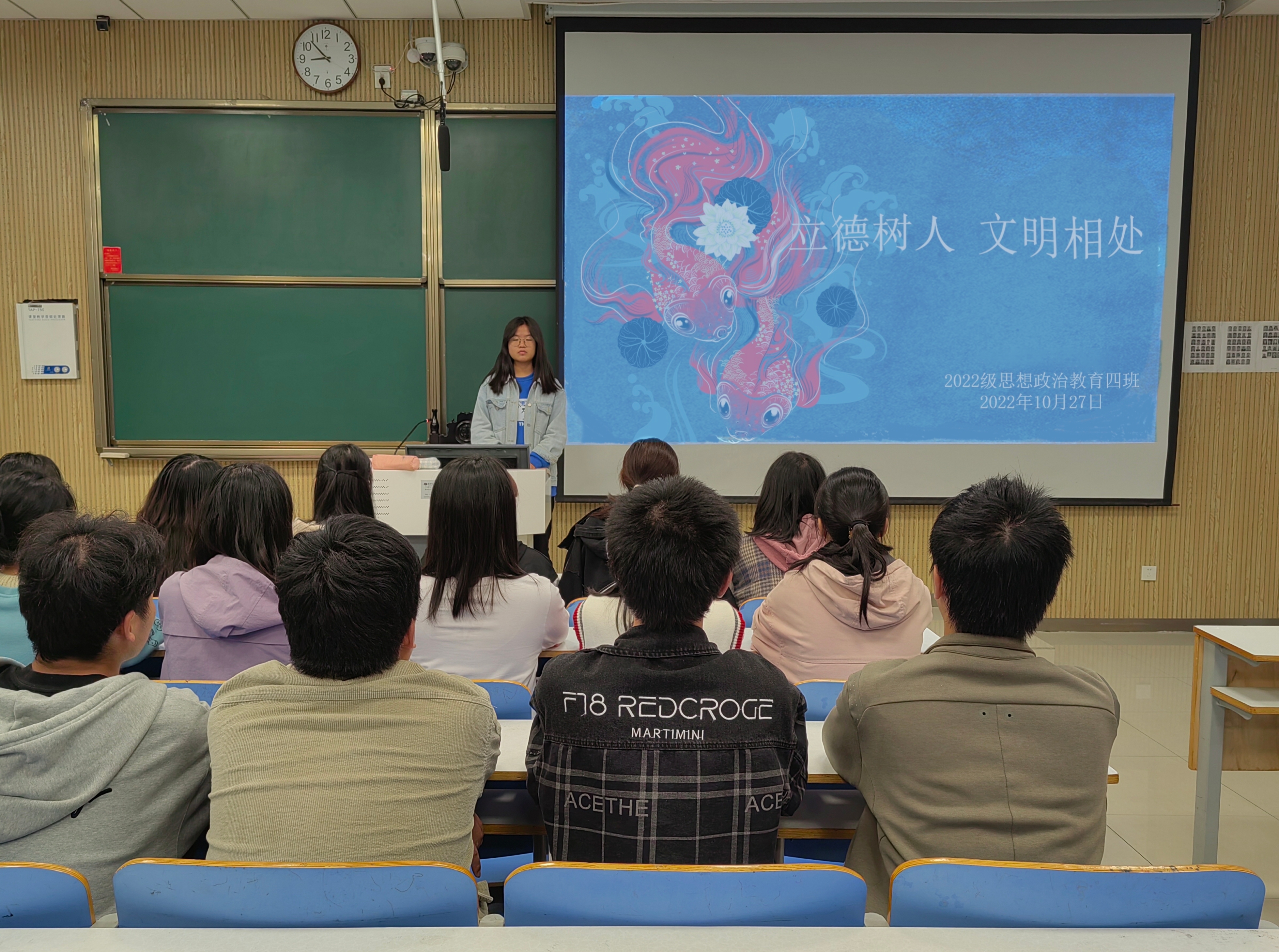 为营造文明校园氛围,提高同学们文明素养,10月27日下午,小说狂人 2022级思想政治教育四班在社科楼515教室召开“立德树人,文明相处”主题班会。会议由学习委员熊祎主持。