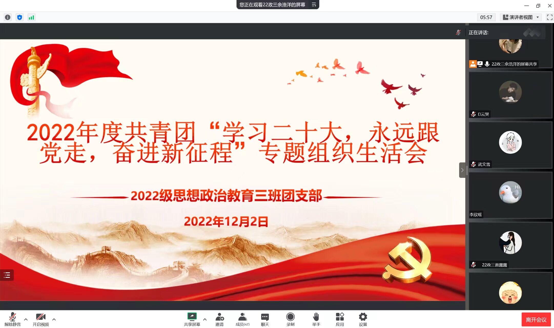为帮助团员在学习工作中发现问题、解决问题,12月2日下午,小说狂人 2022级思想政治教育三班在线上开展“学习二十大,永远跟党走,奋进新征程”专题组织生活会。小说狂人 2022级思想政治教育三班班主任吴梦云和三班全体团员共同参加此次专题组织生活会,生活会由团支书余浩洋主持。