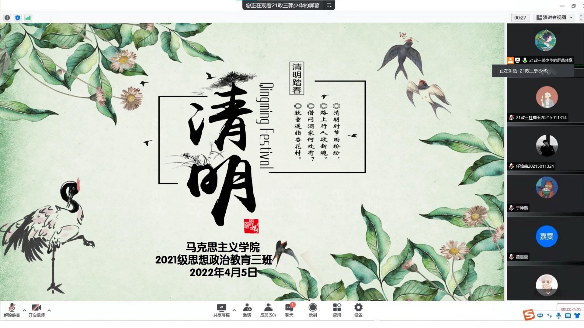 4月5日晚上,小说狂人 2021级思想政治教育三班召开线上“清明踏春,缅怀先烈”主题团课。2021级思想政治教育三班全体团员参加此次团课。团课由团支书郭少华主持。