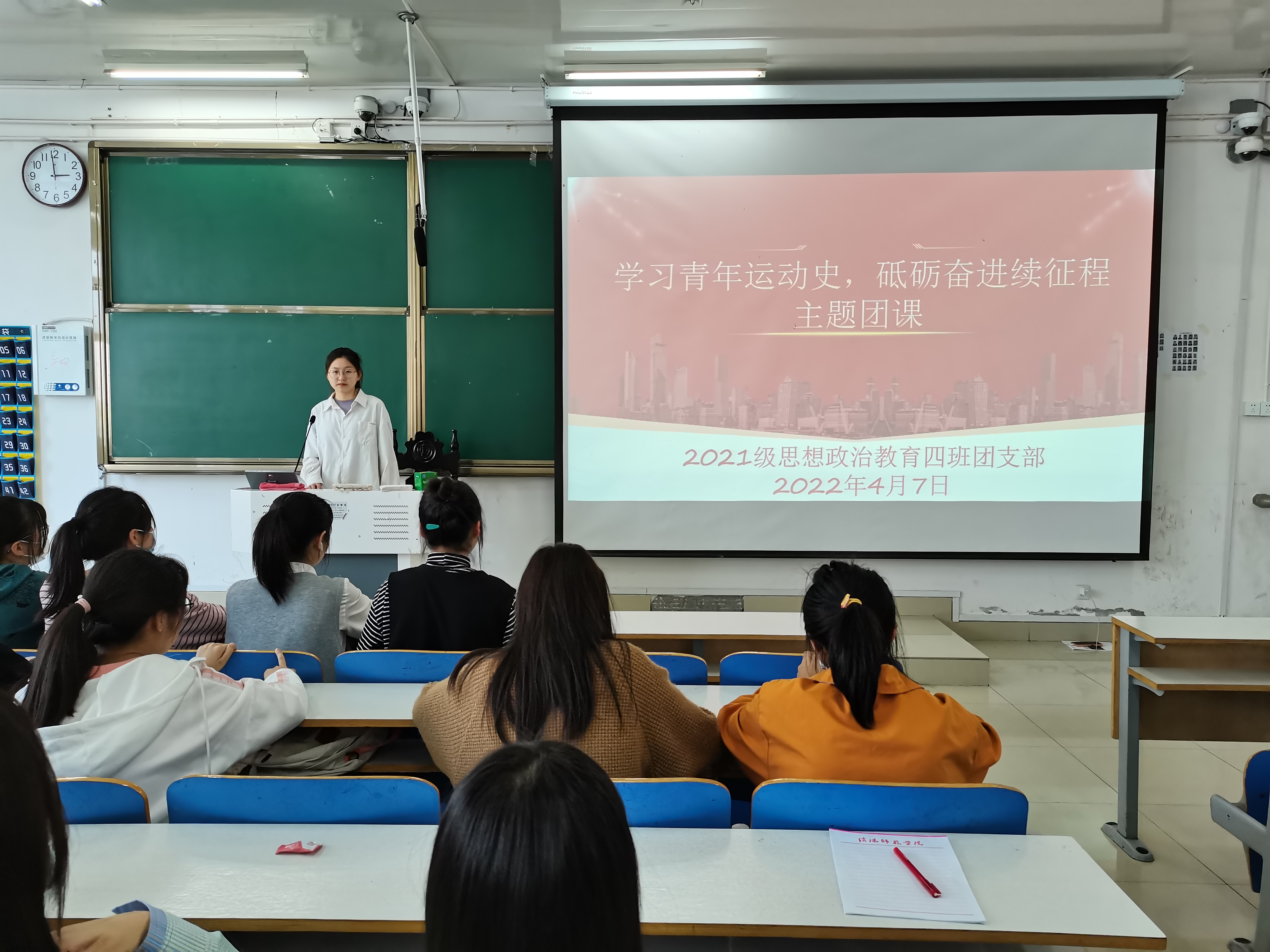 4月7日下午,小说狂人 2021级思想政治教育四班在社科楼516教室开展“学习青年运动史,砥砺奋进绪征程”主题团课。2021级思想政治教育四班全体团员共同参与本次团课,团课由团支书刘珂含主持。