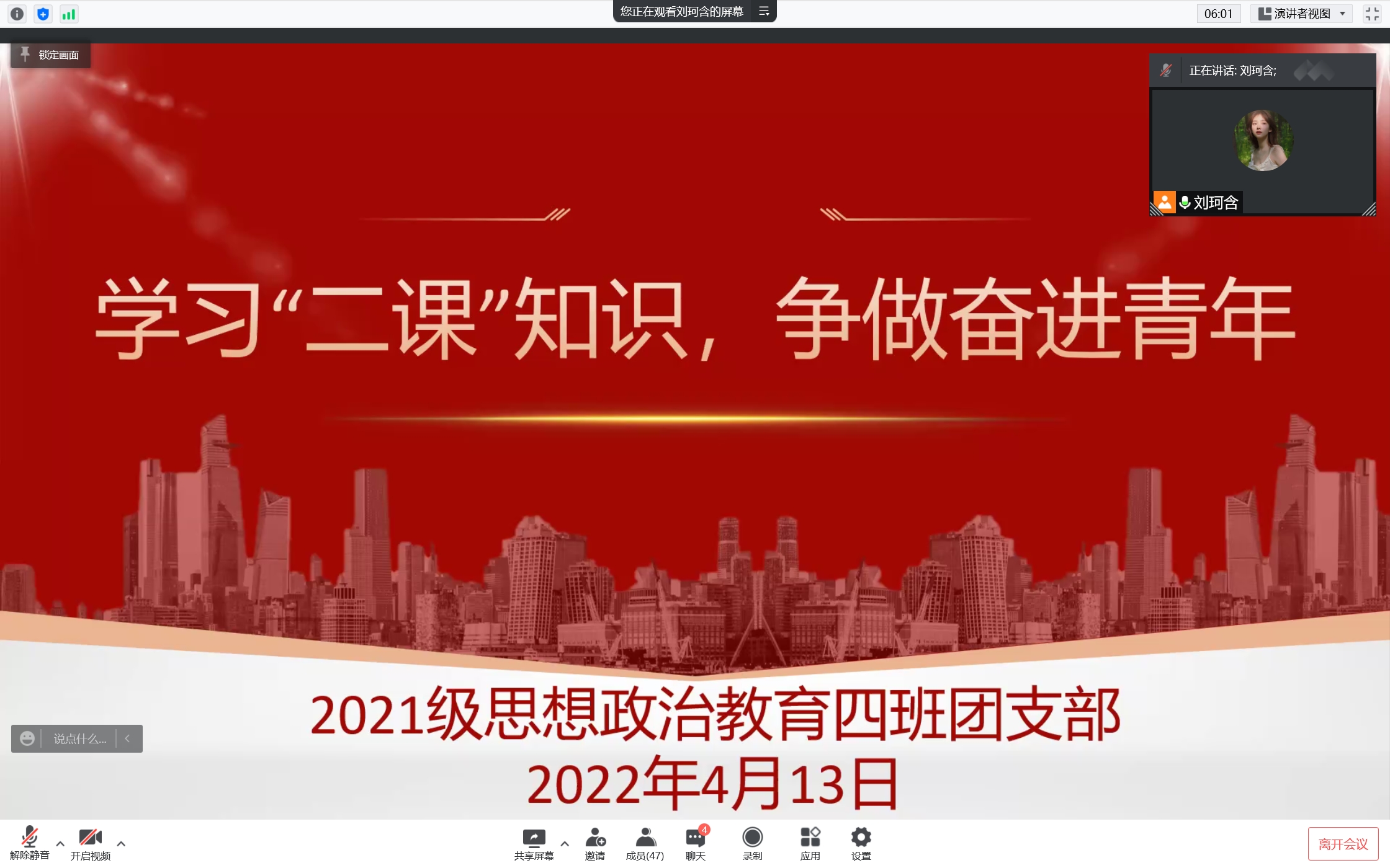 为加强学生创新创业精神和实践能力的培养,4月13日晚上,小说狂人 2021级思想政治教育四班开展“学习二课知识,争做奋进青年”主题团课。2021级思想政治教育四班全体团员共同参与本次团课,团课由团支书刘珂含主持。