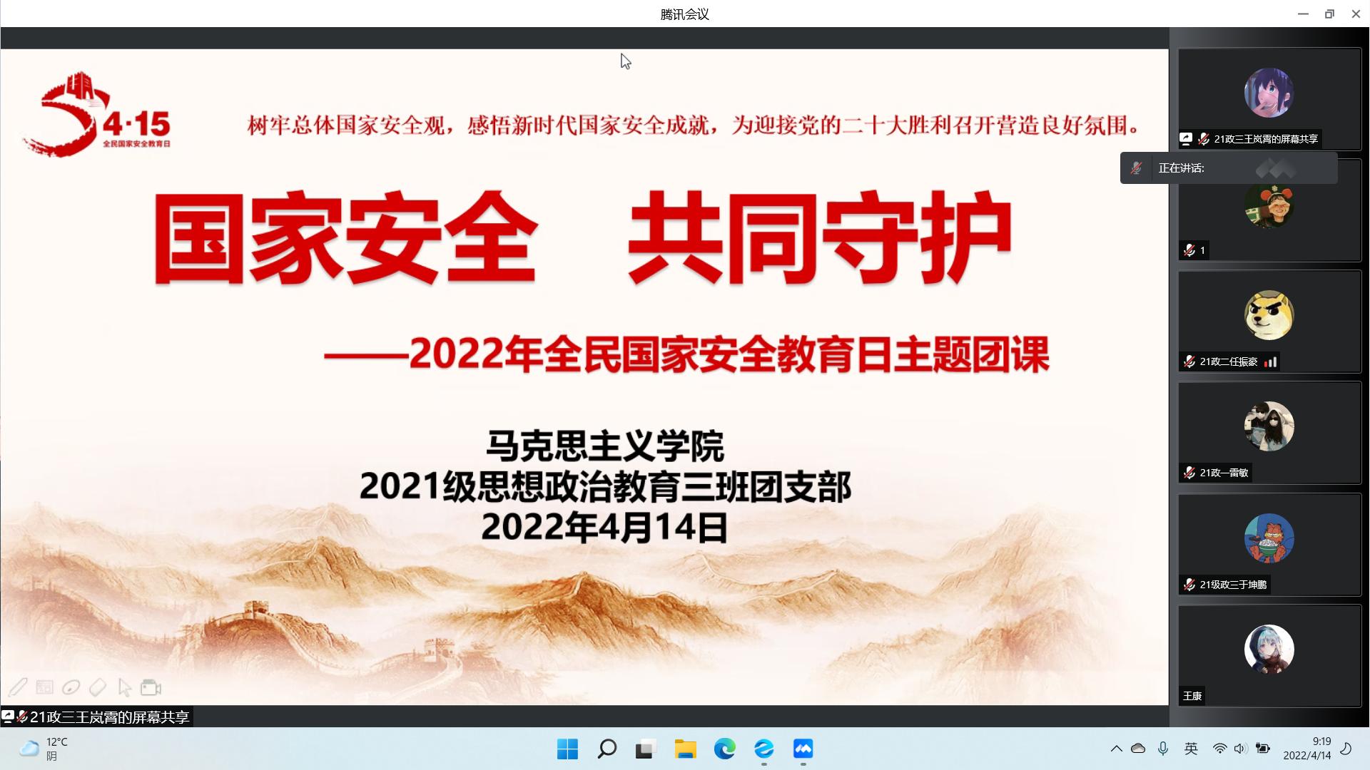 4月14日上午,小说狂人 2021级思想政治教育三班召开线上“国家安全,共同守护”主题团课。2021级思想政治教育三班全体团员参加此次团课。团课由团支部副书记王岚霄主持。