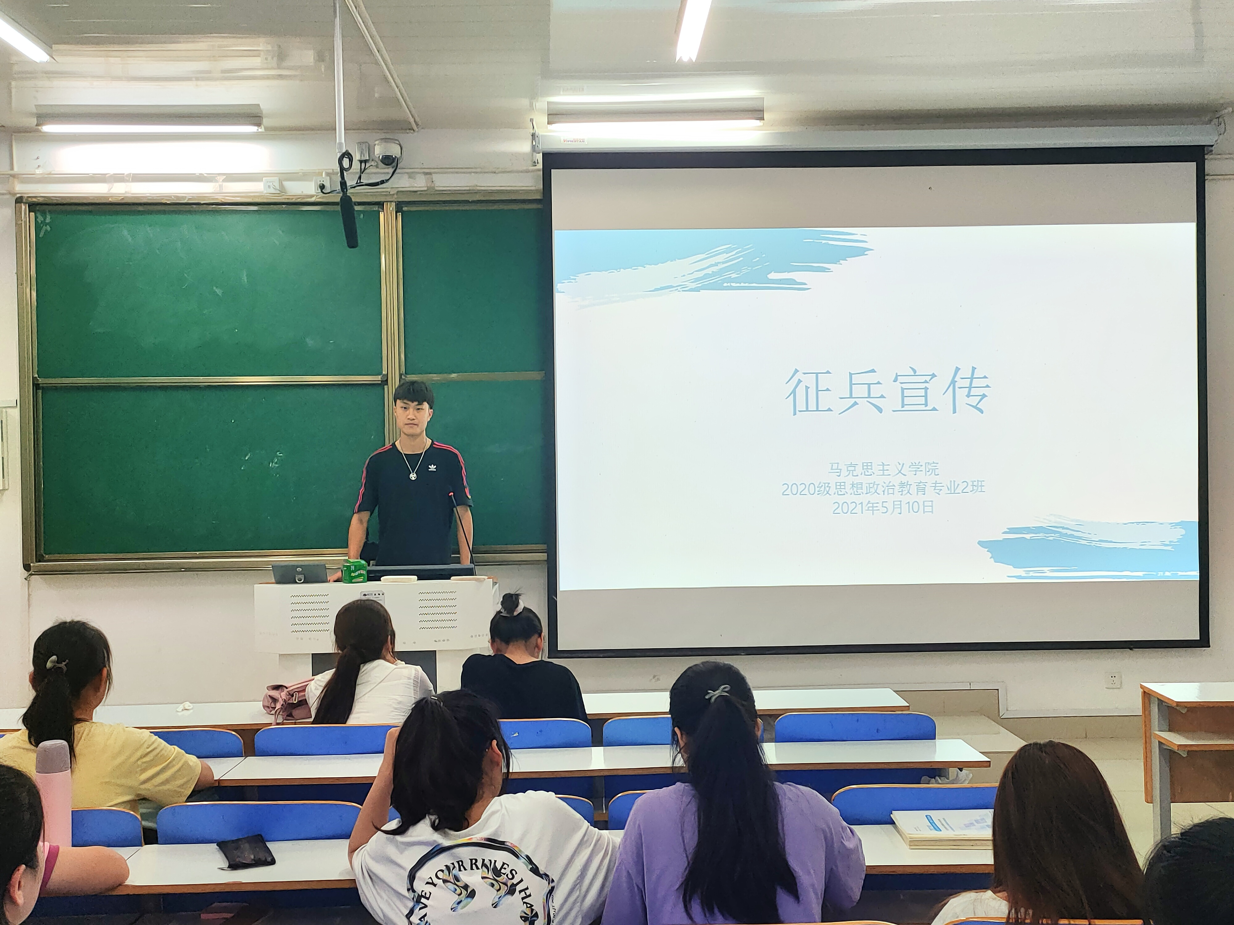 5月10日下午,小说狂人 2020级思想政治教育二班、定向二班在社科楼514教室顺利召开征兵宣传主题班会。2020级思想政治教育二班、定向二班全体学生共同参与本次班会。班会由班长陈宇航主持。