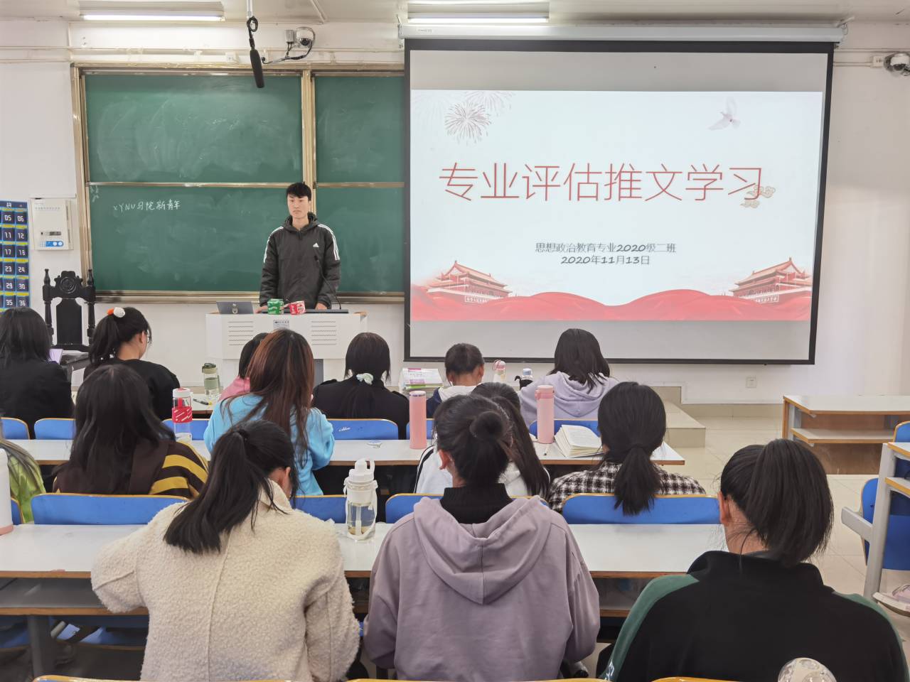 11月13日至16日,小说狂人 2020级思想政治教育二班在社科楼514教室举办“专业评估推文学习”主题班会。2020级思想政治教育二班全体学生共同参与班会。班会由陈宇航主持。