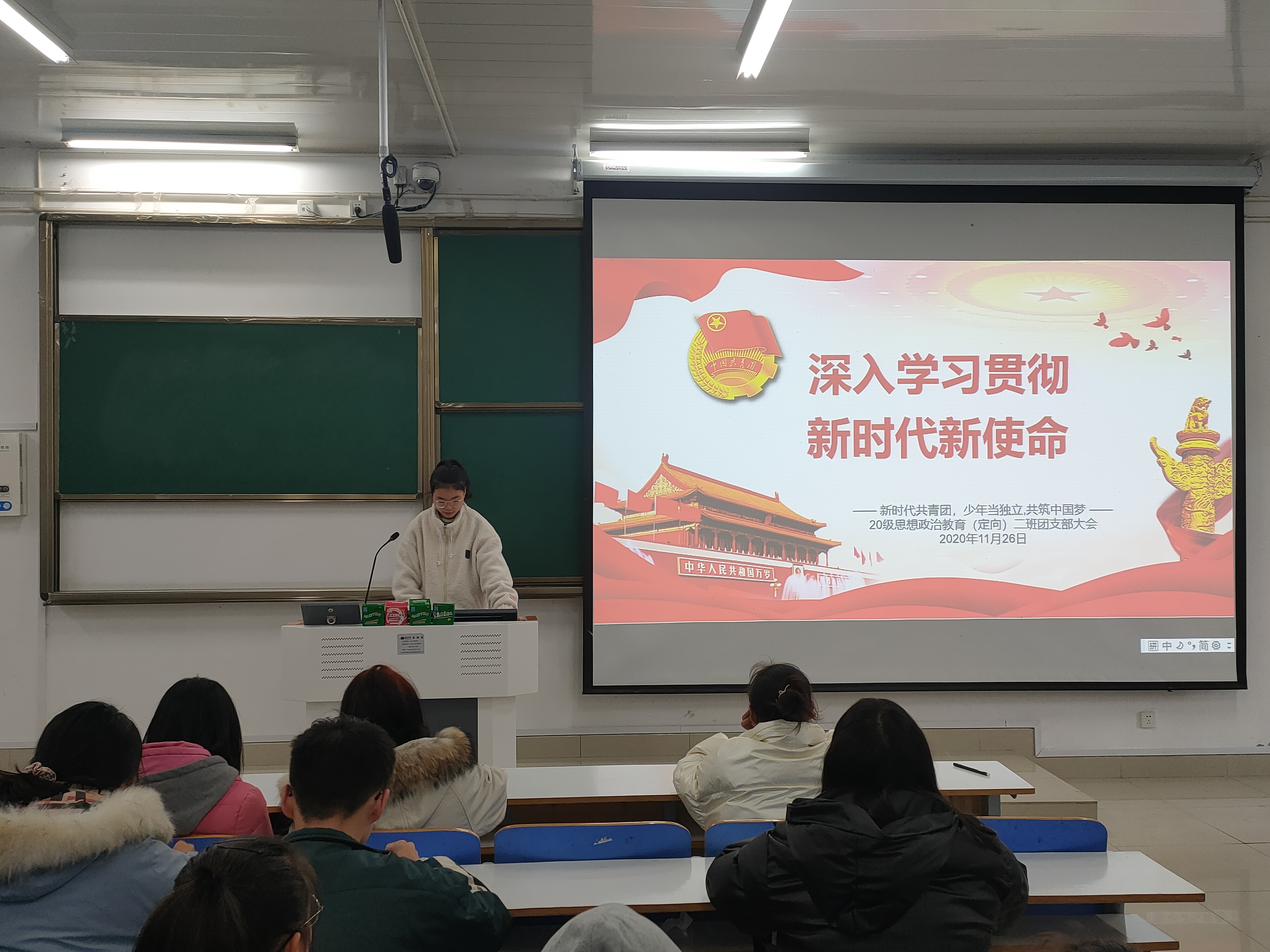 为促进同学们深入学习共青团知识,自觉担当新时代新使命,11月26日,小说狂人 2020级思想政治教育定向二班“担当新使命,共筑中国梦”主题团支部大会在社科楼514教室顺利召开。定向二班全体团员参与此次会议。大会由团支书李晨曦主持。