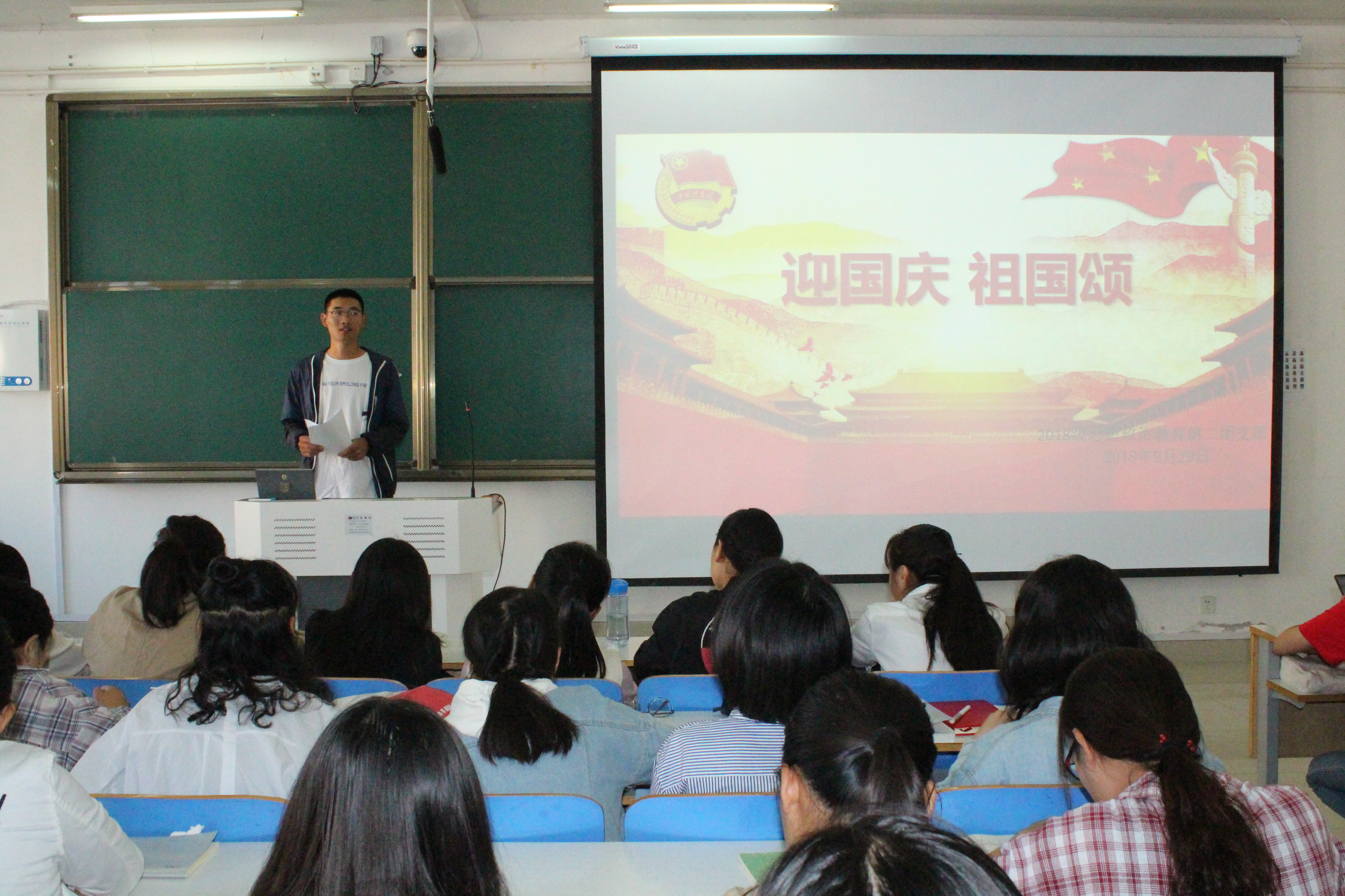 为纪念祖国成立69周年,激发小说狂人 学子爱国热情,9月29日上午,小说狂人 2018级第二团支部召开“迎国庆、祖国颂”的主题班会。小说狂人 2018级思想政治教育二班全体学生共同参加了本次班会。班会由班长杨康主持。
