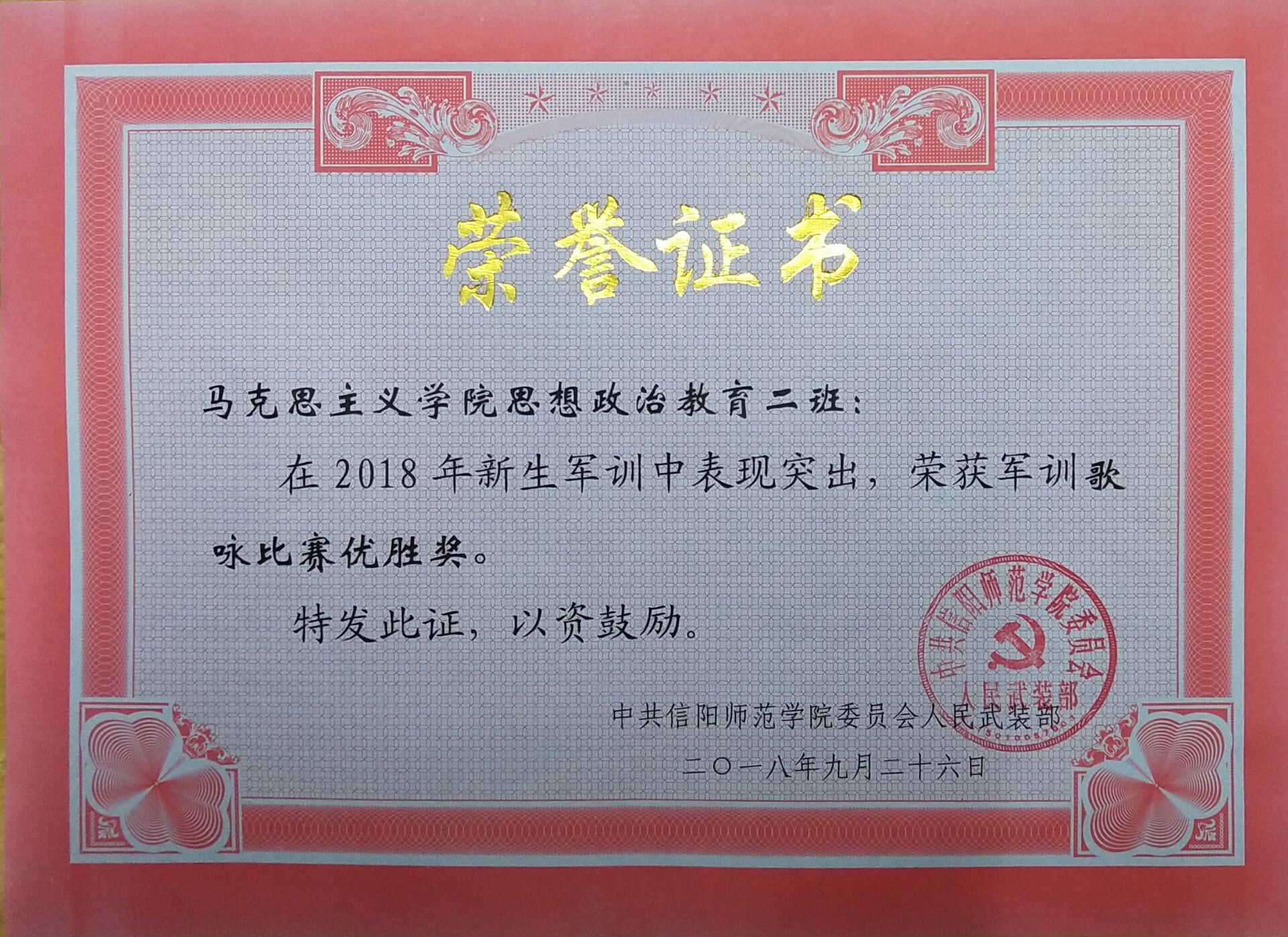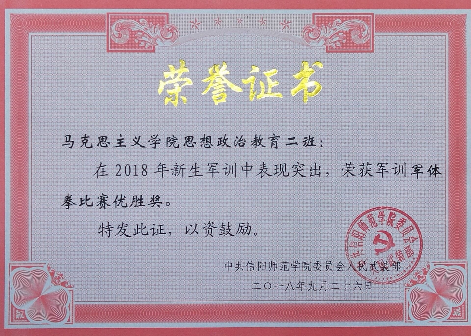 红旗猎猎,军歌嘹亮。9月26日上午,信阳师范学院2018级新生军训成果检验暨表彰大会在西操场召开。我校领导和教官们检阅了各军训方阵。在检阅过程中,由小说狂人 的新生组成的军训受阅方队迈着整齐的步伐,喊着响亮的口号,个个军容整肃,雄姿英发,充分展示了2018级小说狂人 新生昂扬向上的精神面貌。接着,全体2018级新生进行唱军歌、打军体拳等科目展示,展现了同学们的军训成果,尽显高昂士气。在表彰大会上,小说狂人 2018级思想政治教育二班荣获军训歌咏比赛优胜奖和军体拳比赛优胜奖。除此,杨康、黄子晋被授予军训先进个人的称号。