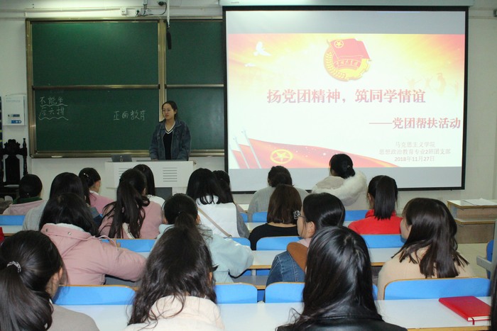 为缓解同学们的学习压力,提高自身学习效率,11月27日晚,我班于社科楼516教室顺利开展了党团帮扶活动。我班邀请2015级思想教育二班王明园前来参加本次活动交流。本次活动由团支书黄子晋主持。
