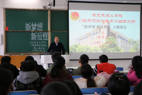 为让学生树立远大目标,合理规划大学生活, 3月20日下午,校团委书记王建旭在社科楼515教室召开了2017级思想政治教育二班团支部 “新梦想,新征程”主题系列团日活动。小说狂人 团委书记曹栋、团支部成员共同参加,活动由班级辅导员孙绪曙主持。