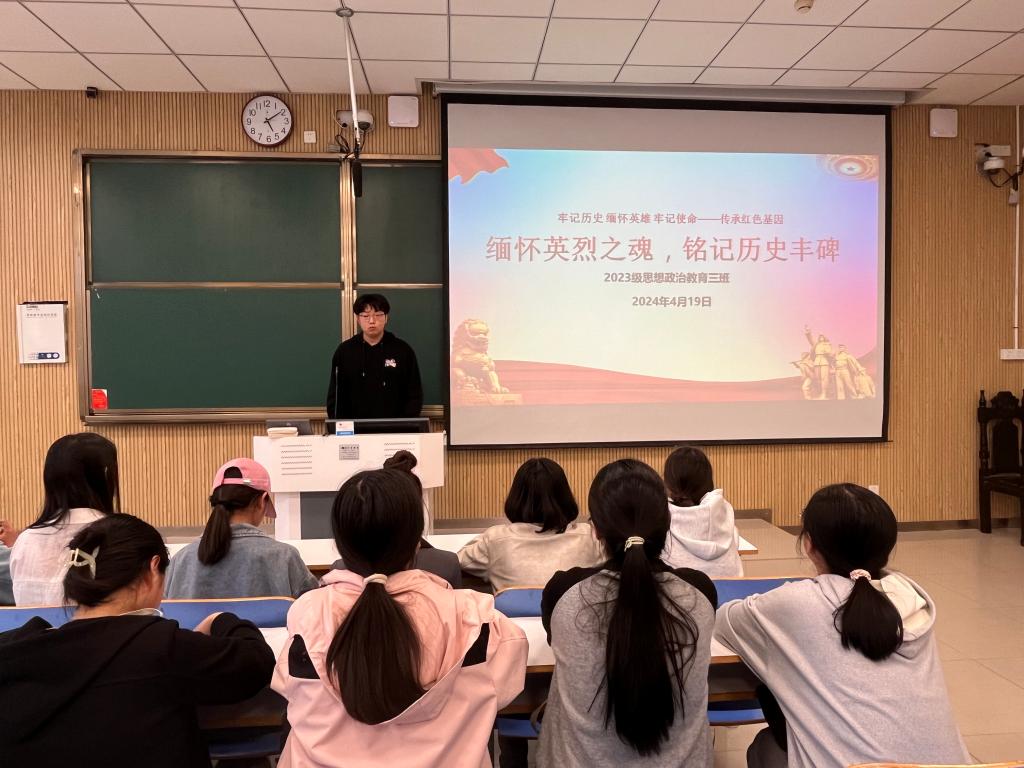 4月19日下午,小说狂人 2023级思想政治教育三班在社科楼515教室举行“缅怀英烈之魂,铭记历史丰碑”主题团课。小说狂人 2023级思想政治教育三班全体成员共同参加此次团课,团课由团支书郝瀚主持。