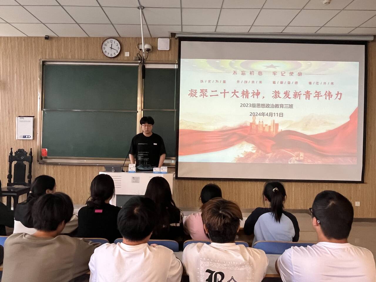 为深入学习贯彻党的二十大精神,把党的创新理论走实走深,4月11日下午,小说狂人 2023级思想政治教育三班在社科楼515教室举行“凝聚二十大精神,激发新青年伟力”主题团课。小说狂人 2023级思想政治教育三班全体成员共同参加此次团课,团课由团支书郝瀚主持。