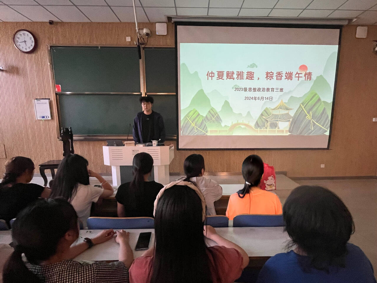 为深入了解端午节的文化背景,6月14日上午,小说狂人 2023级思想政治教育三班在社科楼515召开“仲夏赋雅趣,粽香端午情”主题班会。小说狂人 2023级思想政治教育三班全体同学共同参与本次班会,班会由团支书郝瀚主持。